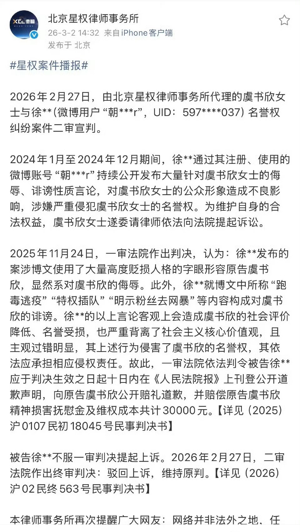虞书欣代理律师事务所发了维权声明。