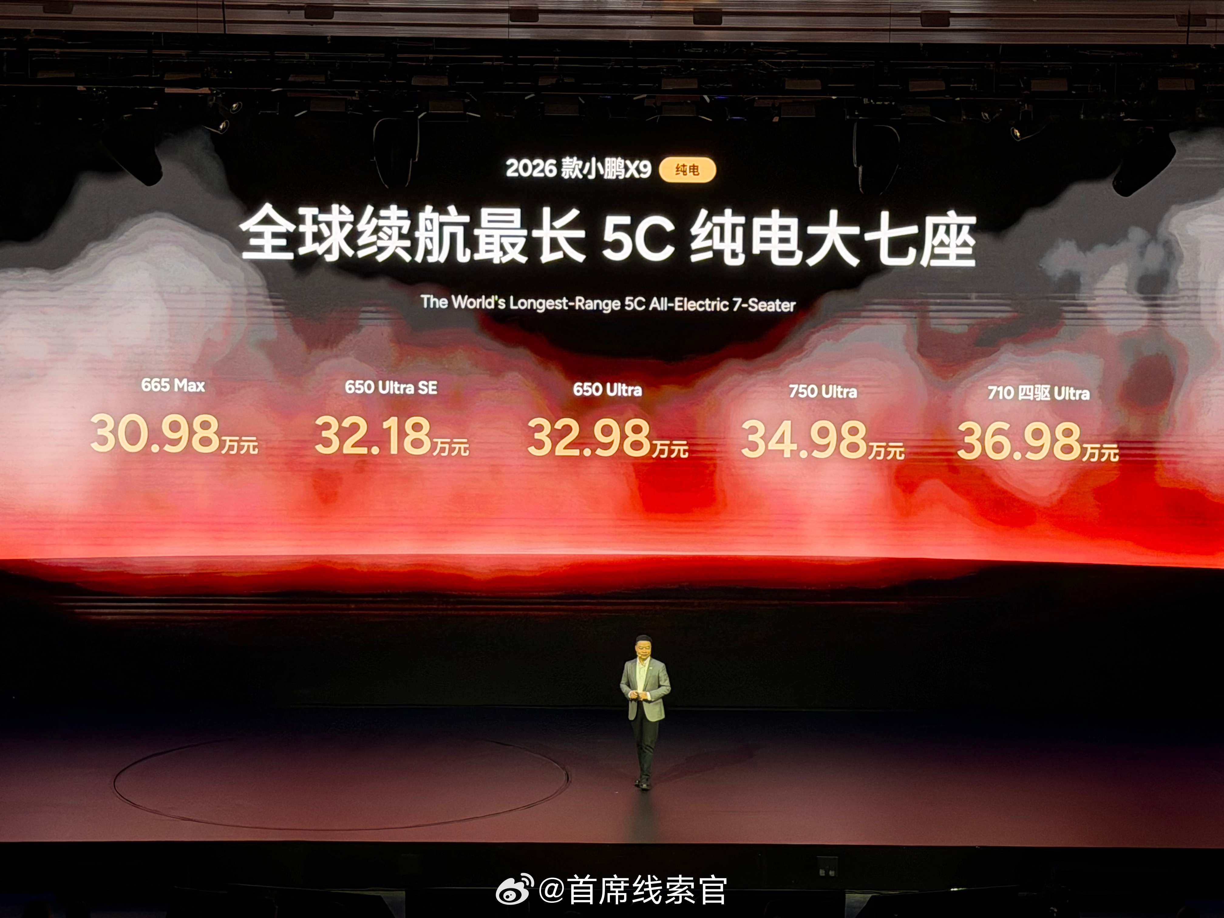 2026款小鹏X9纯电版新车共推出5款版型,包括665 Max、650 Ultra SE、650 Ultra、750 Ultra以及710 四驱Ultra,官方指导售价分别为30.98万元、32.18万元、32.98万元、34.98万元、36.98万元