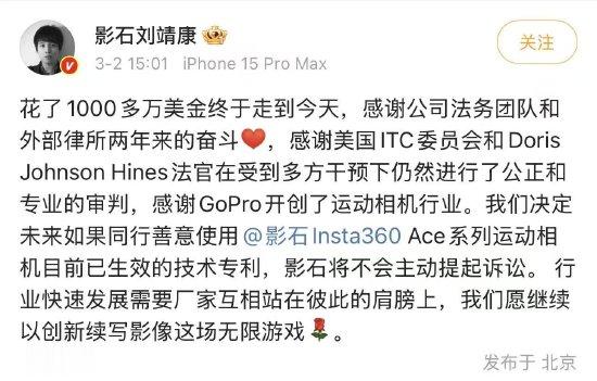 新浪科技讯3月2日下午消息,影石创始人刘靖康发文,对337调查终裁胜诉进行回应。
