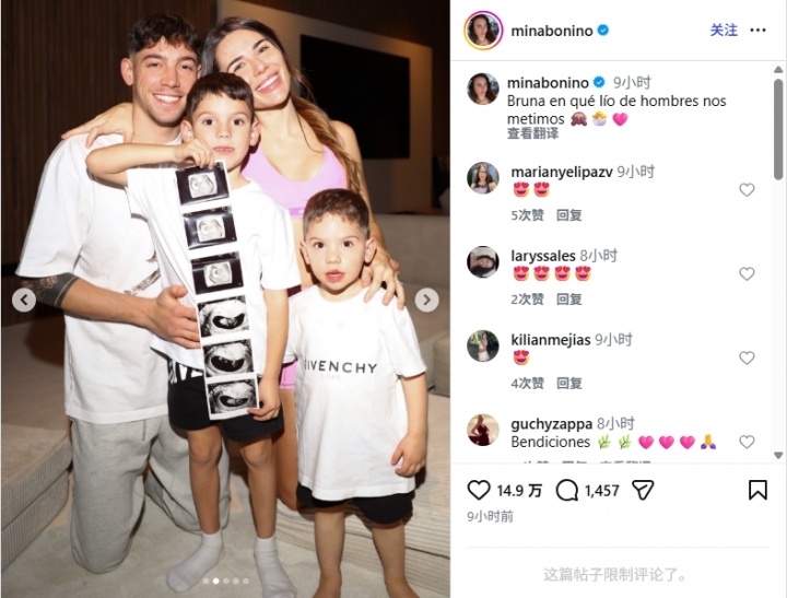 米娜·博尼诺此前曾公布自己已经怀孕12周,而且是个女孩。她也在社媒调侃道:布鲁娜,我们这是陷入了怎样的男人堆里啊。