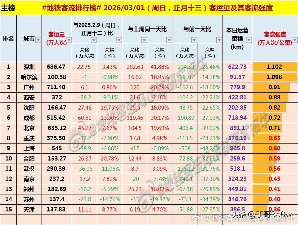 3月第一天全国有15个城市地铁客流量超过百万人次[呲牙][呲牙][呲牙] 爆料 身边事 客流 城轨客运量 昨日客流 地铁客流排名 周日 2026年3月1日 星期天 全国重点城市轨道交通客流量排行榜: 广州:711.40万 深圳:686.47万深圳地铁 北京:635.42万北京地铁 上海:545.00万 成都:515.42万 重庆:375.50万重庆地铁 西安:372.00万西安地铁 武汉:290.39万 南京:237.20万南京爆料 郑州:182.69万郑州身边的事 沈阳:166.47万沈阳地铁 合肥:153.27万合肥身边事 天津:137.83万 苏州:137.40万苏州身边事 哈尔滨100.58万