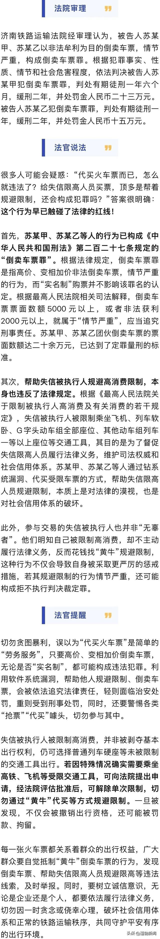 近日,山东济南铁路运输法院依法公开审理了一起特殊的倒卖车票案,被告人苏某甲、苏某乙为失信被执行人规避消费限制、代买火车票并从中牟利,最终因倒卖车票罪被依法追究刑事责任。