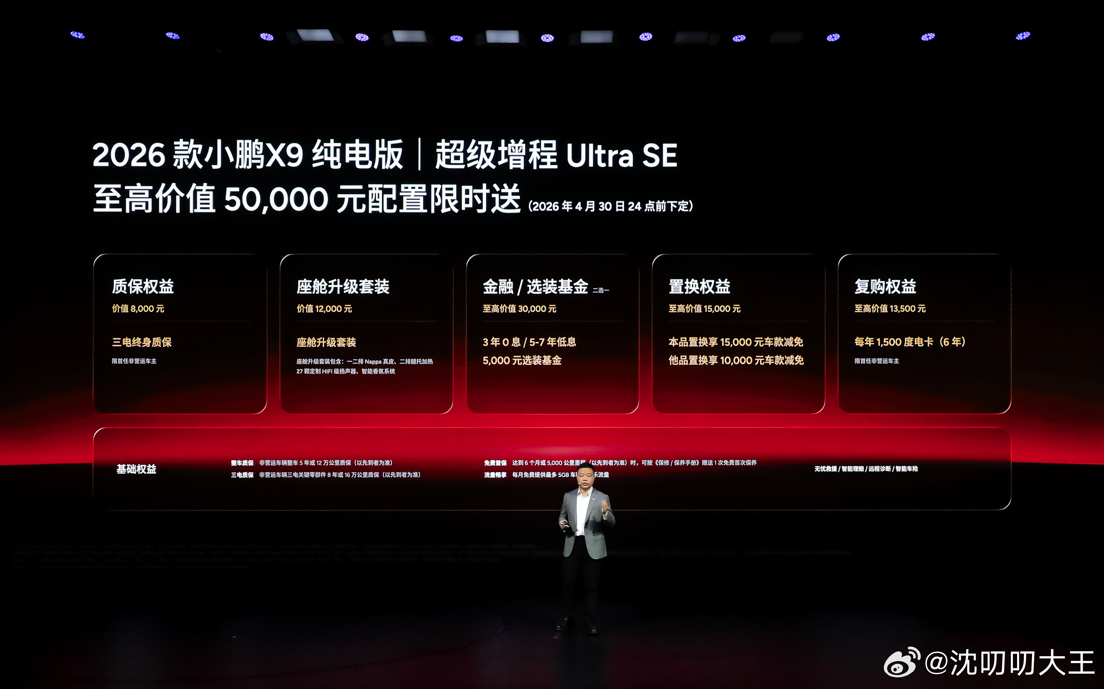 即日起至2026年4月30日24点(含)前下定2026款小鹏X9纯电版,可享最高价值50,000元 权益限时送,包含三电终身质保、价值12,000元的座舱升级套装、至高价值30,000元金融/选装基金、至高价值15,000元置换权益以及每年1500度电卡(6年)的复购权益。