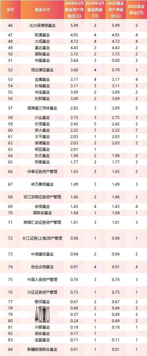 排名20位以后的公司规模竞争更为激烈。银华基金(43.51亿元)、建信基金(36.21亿元)、天弘基金(35.27亿元)、前海开源基金(33.95亿元)、万家基金(32.42亿元)、摩根基金(32.22亿元)、嘉实基金(31.73亿元)等公司组成第二梯队,规模集中在30亿-60亿元区间,排名咬合紧密。