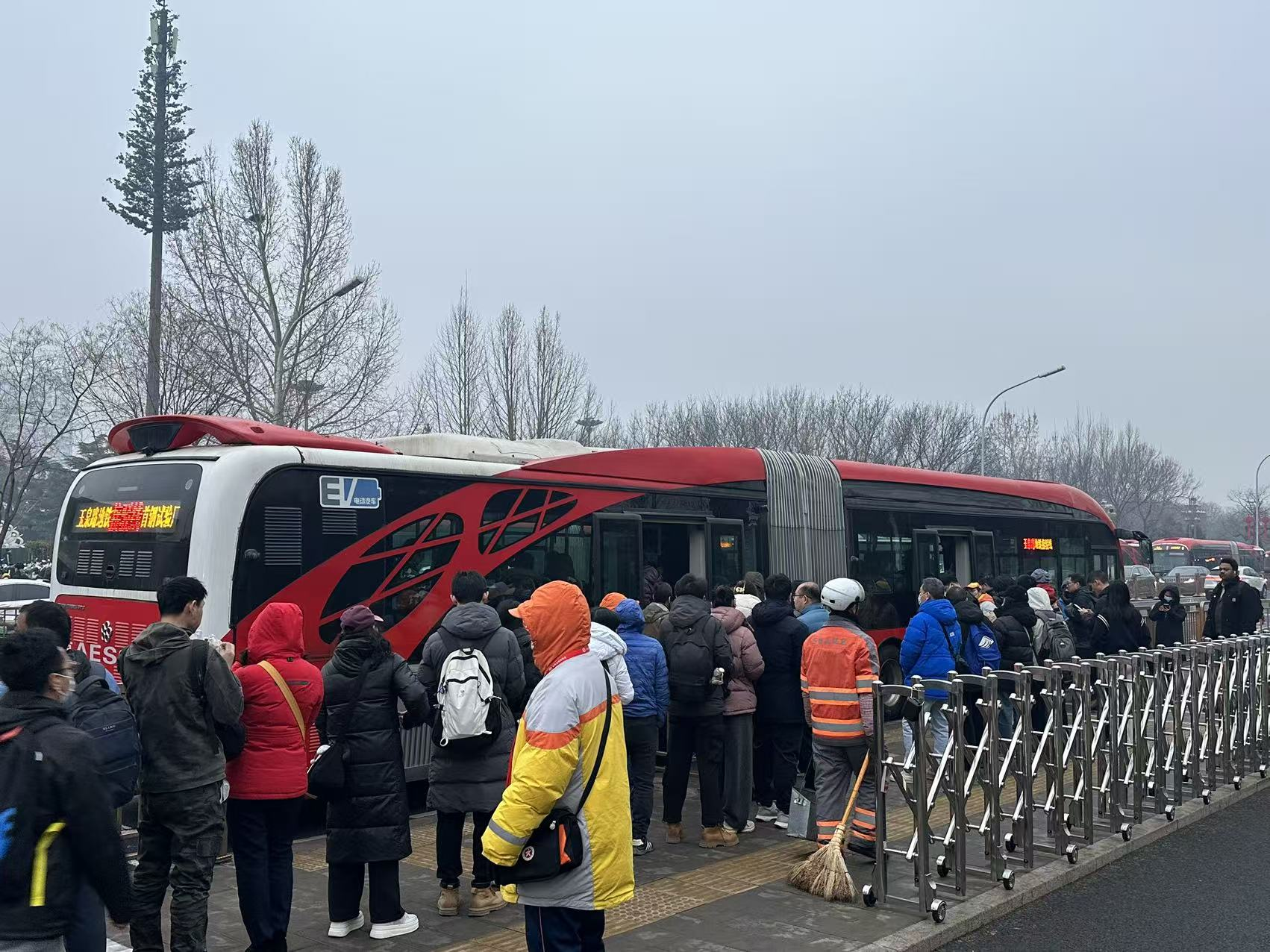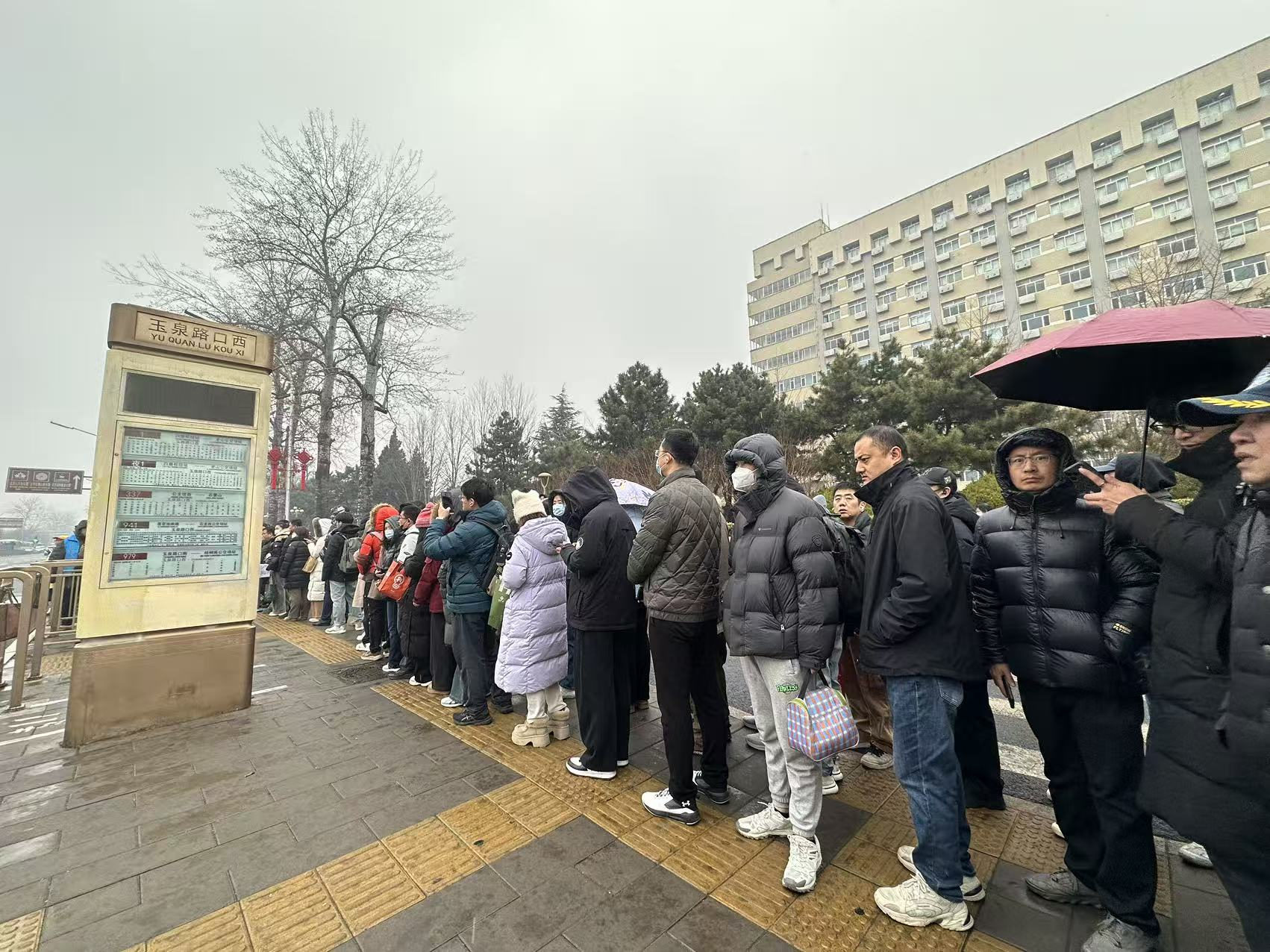 在地铁站外,公交站台同样人流密集,候车队伍排起长龙。在玉泉路口西公交站(向西方向),337路、941路及接驳公交车辆抵达时,车厢迅速满载,仍有大量乘客未能上车。此外,站台设置了临时隔离栏杆,并标明各线路排队区域,引导乘客有序候车。