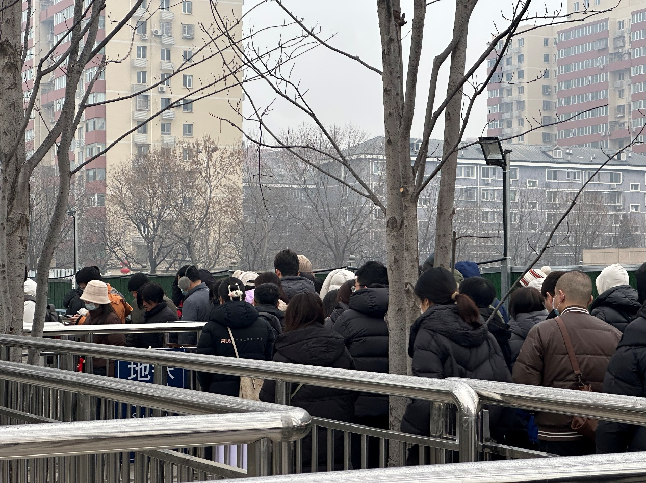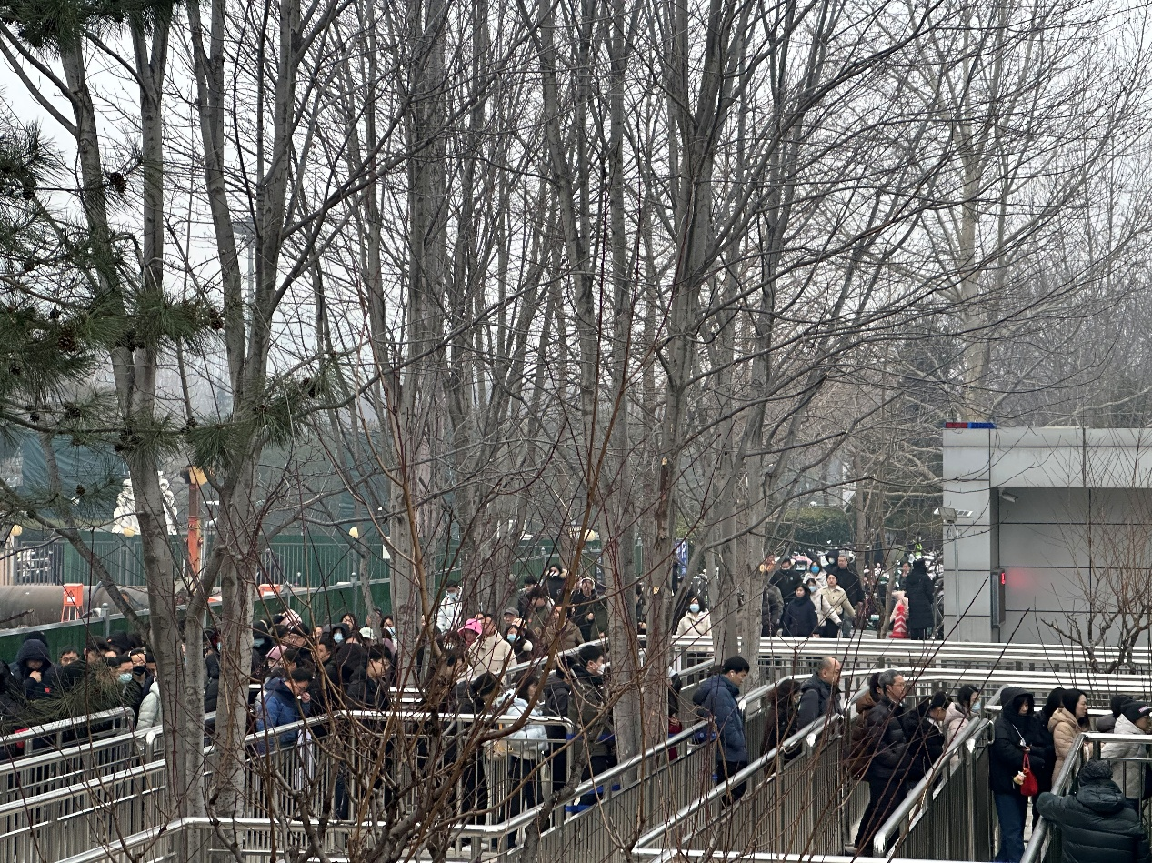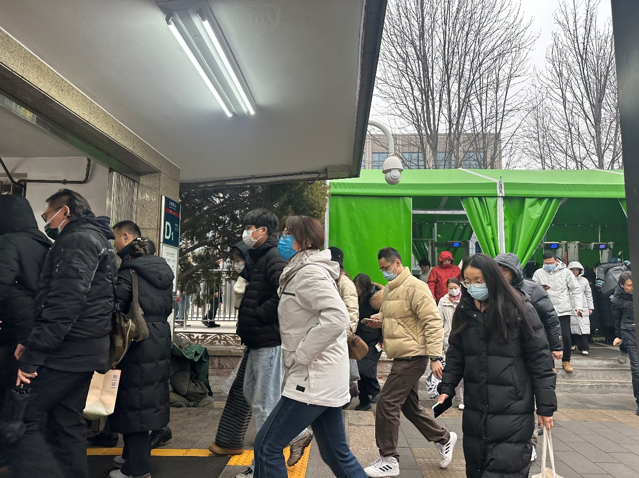 早高峰时段,四个出入口中,西南口排队人数最多,安检口已外移至车站外;东南口次之,而北侧两个口则相对冷清。记者注意到,尽管西南口排队人数较多,但附近的过街天桥可通往其他出入口,建议乘客合理选择进站通道,避开人流集中的西南口,以提升进站效率。