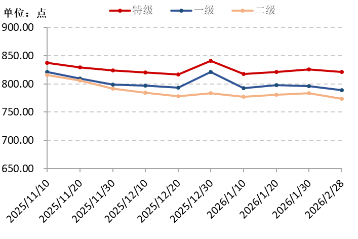从质量等级维度来看,截至2月28日,特级花椒价格指数报820.91点,较上期下跌0.56%,较基期下跌17.91%;一级花椒价格指数报789.16点,较上期下跌0.85%,较基期下跌21.08%;二级花椒价格指数报773.34点,较上期下跌1.31%,较基期下跌22.67%。