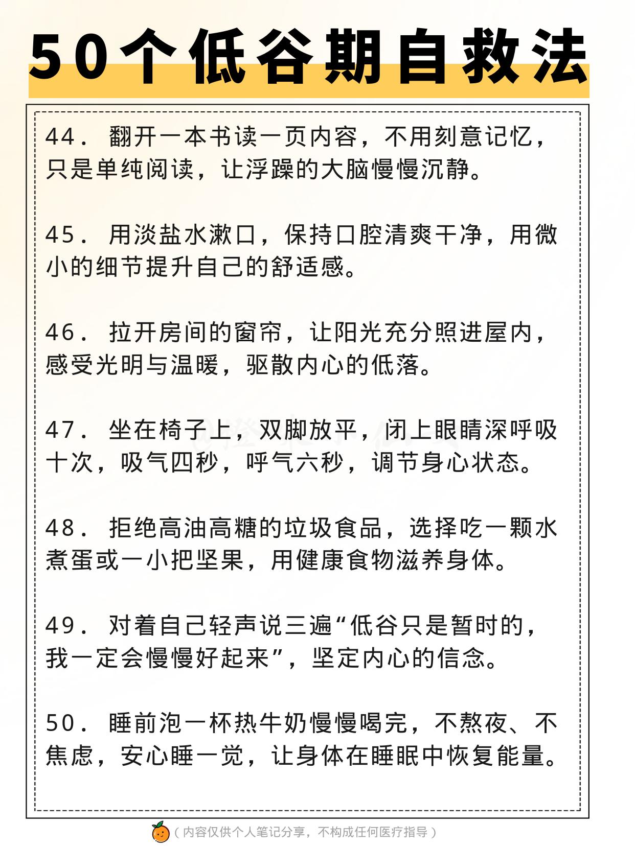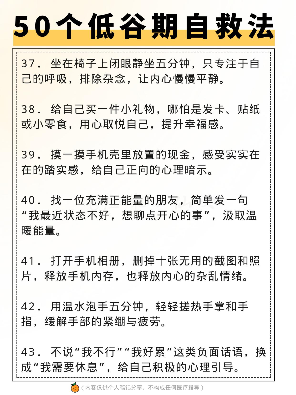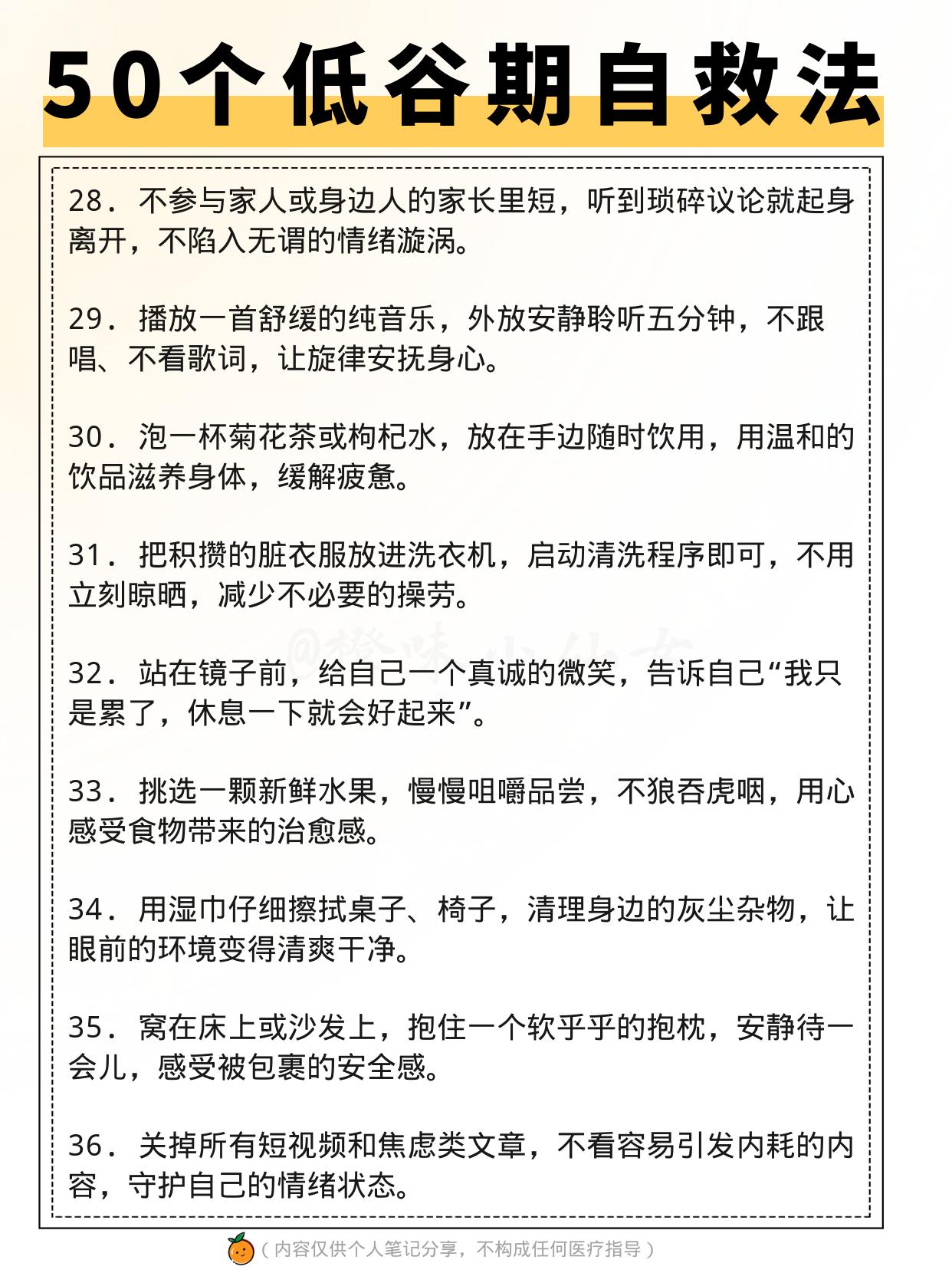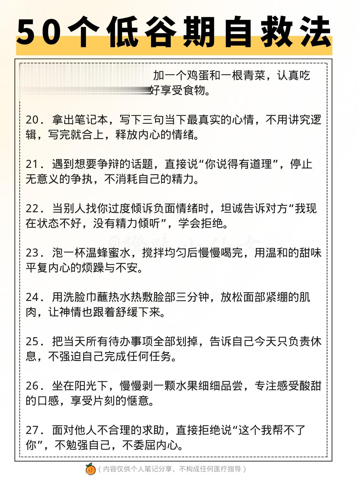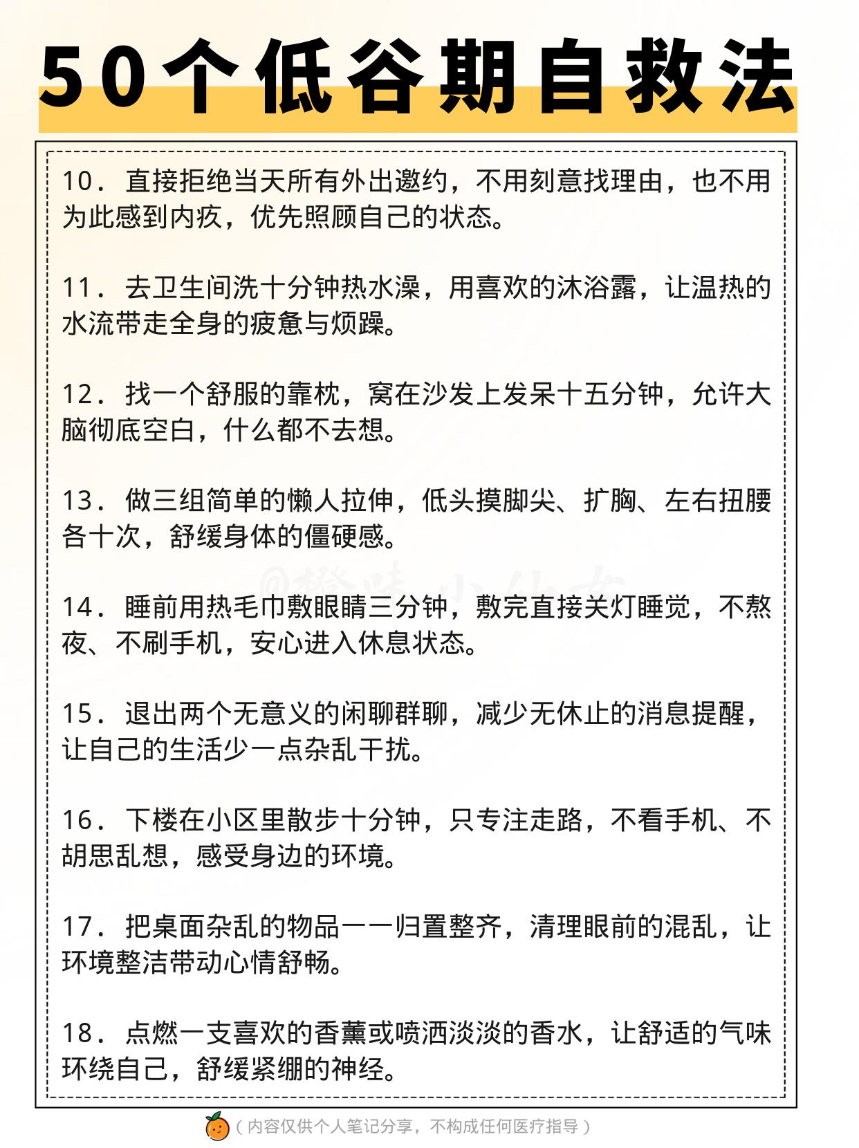 能量耗尽别硬撑!50个自救法,快速满血复。💡你一定有过这样的时刻: 明明没有高强度劳作,却浑身乏力、不想说话、不愿社交,对任何事情都提不起兴趣,大脑昏沉、情绪低落,整个人就像电量彻底耗尽的机器。 很多人在这种状态下,只会强迫自己硬扛, 用意志力勉强支撑,结果只会越来越疲惫。 当你能量耗尽、疲惫不堪时, 最不需要的就是强行加油和自我逼迫。 🫂你不必立刻振作, 不必事事完美, 更不必硬撑着假装坚强。 🆘真正的自救,从来不是空洞的大道理, 而是这些微小、具体、能立刻做到的行动。 累了就停下来,用这些