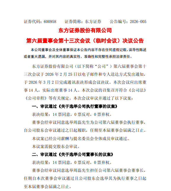 3月2日晚,东方证券发布董事会决议公告,选举周磊为公司董事长、执行董事和董事会战略与可持续发展委员会主任委员、薪酬与提名委员会委员,均自公司召开临时股东会审议通过选举其为公司执行董事之日起履职。