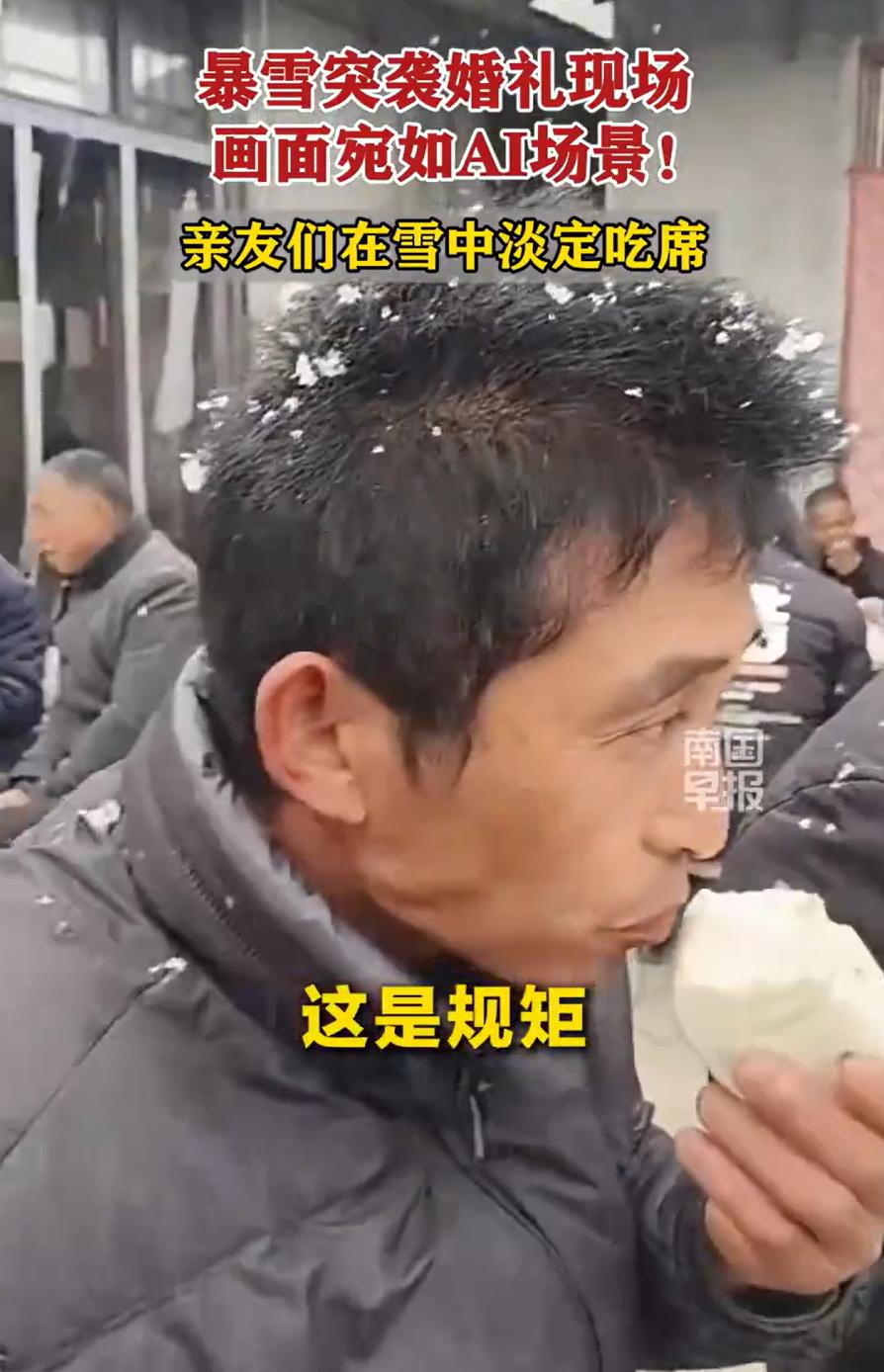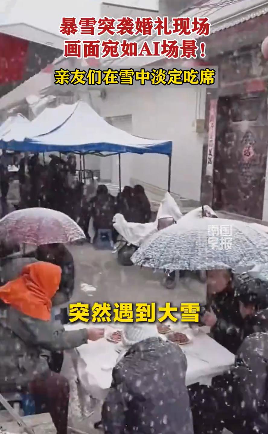 这真是白头偕老了!河南安阳,一对新人结婚,谁知婚礼当天突降暴雪,可即便如此,婚礼也是照样进行,甚至婚宴都是在暴雪中吃的,网友:好歹搭个棚子啊! 婚礼现场的视频在网上传开,宾客们撑着伞坐在雪地里,桌上的菜盘子落满了雪花,凉菜刚端上来就自带冰镇效果 仔细看当时的情况,不是没搭棚,是搭的棚子根本扛不住这场暴雪。雪下得太急太猛,原本准备的那个防雨棚只能挡挡小雨,雪一积厚就往下塌,最后只能撤掉。这下好了,一桌桌酒席直接暴露在大雪里 换成别的地方,遇上这种天气,酒席八成要改期,或者挪到屋里挤一挤。但这家人硬是顶着雪把席办完了。婚庆的人说,当地老辈人讲究,婚期定了就不能改,改了不吉利。来的宾客也都是亲戚朋友,没人愿意走,撑把伞,抖抖身上的雪,该吃吃该喝喝 画面确实有意思。满院子白茫茫一片,红桌布上落着雪,新郎新娘挨桌敬酒,雪花飘在头发上,一会儿就化了。老人们裹着棉袄,年轻人把羽绒服帽子扣上,小孩子一边吃一边接雪花玩。有人说这席吃得浪漫,也有人嘀咕新人是不是太较真 其实我倒觉得,这场雪中婚礼,比任何一个精心布置的室内婚礼都来得真实。生活本来就是没法完全掌控的,你准备得再好,该来的雪还是会来。重要的是人来了,情义到了,雪再大也拦不住 新人最聪明的地方是没较劲。棚子塌了就不搭了,雪飘进来就飘进来,凉菜先上就凉菜先上,热菜上来冒着热气,雪花落进去,热气和冷气一碰,看得见的人间烟火。宾客也没人矫情,雪地里坐着,筷子照常伸,该碰杯碰杯,该说笑说笑