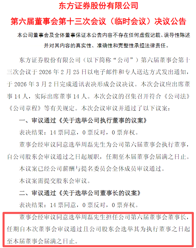3月2日晚,东方证券(600958.SH)发布董事会决议公告,选举周磊为公司董事长、执行董事和董事会战略与可持续发展委员会主任委员、薪酬与提名委员会委员,均自公司召开临时股东会审议通过选举其为公司执行董事之日起履职。