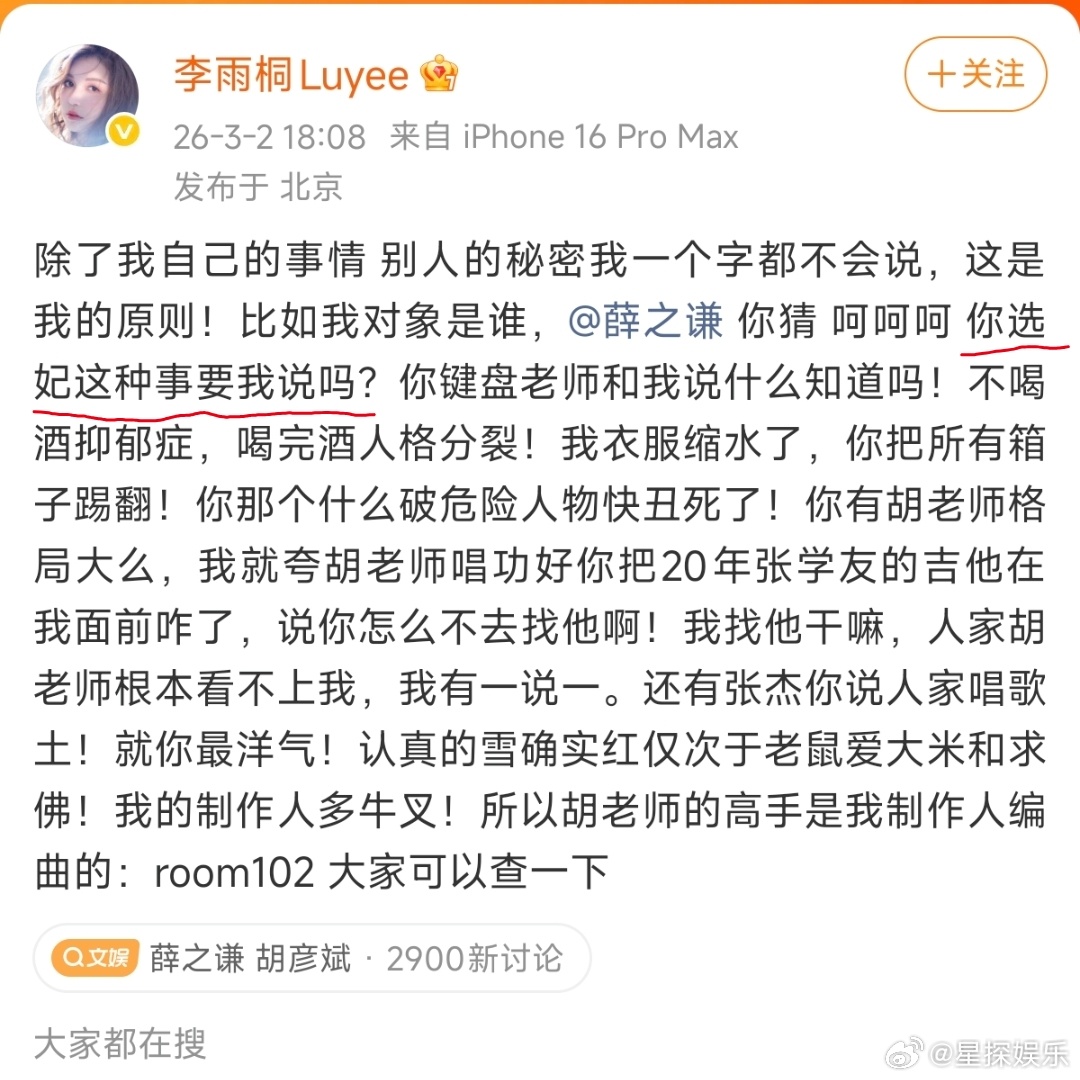 薛之谦 选妃从重婚到选妃,这瓜的尺度真的越来越大了。抛开情绪不谈,现在最核心的难道不是证据吗?一句反问确实有冲击力,但大家想要的是实锤,不是小作文。薛那边还在发巡演海报,李这边连珠炮似的爆料,十年了,到底什么时候能有个定论?