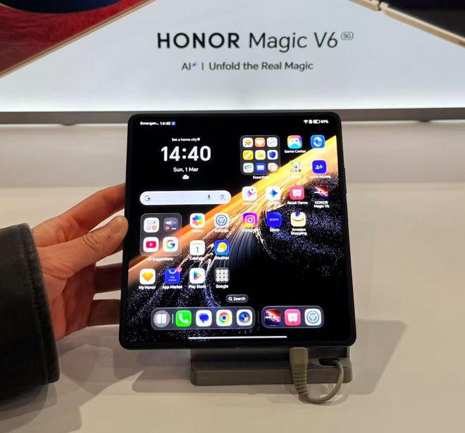在今天发布会上,荣耀还面向全球市场发布了平板、PC等IoT产品。会后展台上我们看到了此次发布的旗舰折叠屏新机MagicV6。