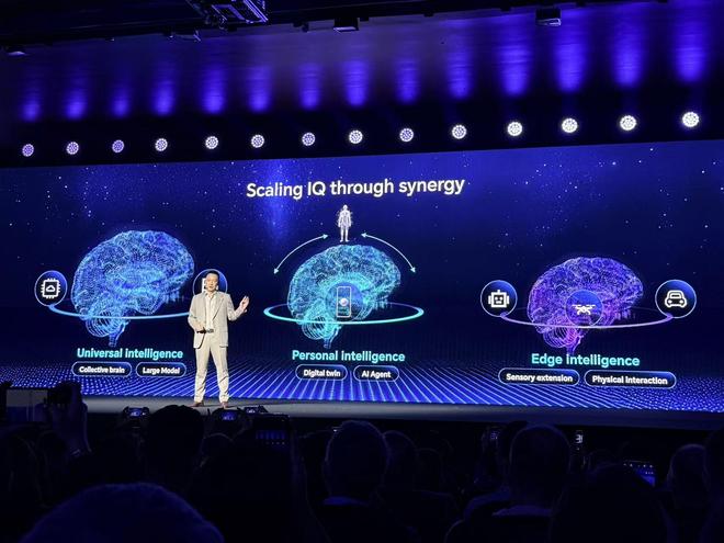 个人智能包括手机等便携设备,可以主动服务、持续进化、记住个人习惯;全局智能是“超级大脑”,整合了云端AI能力,比如Gemini、ChatGPT、Qwen;边缘智能则是感知世界的“触角”,比如机器人、低空飞行器等。