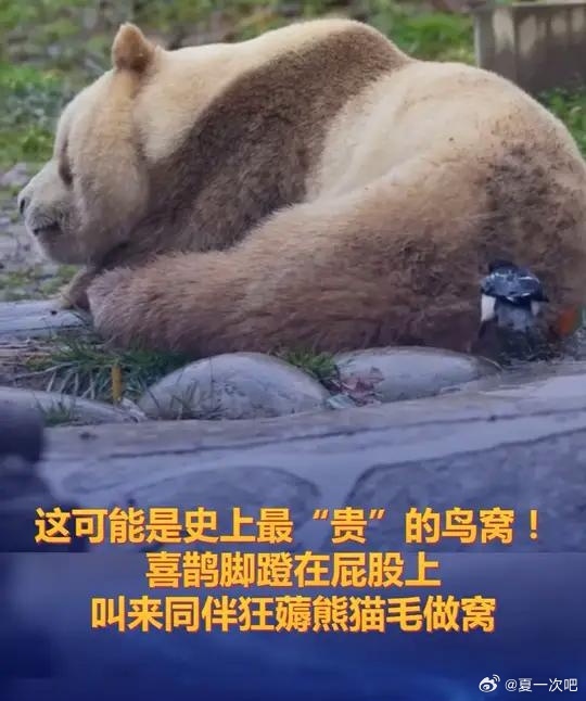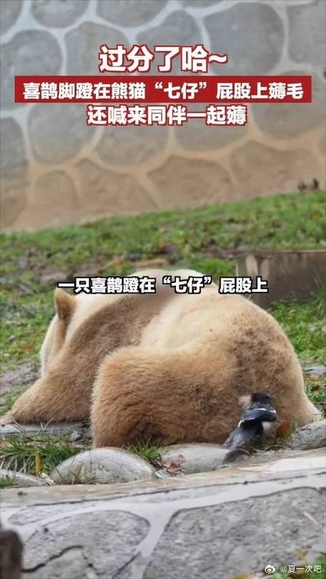 俩喜鹊从熊猫屁股上薅毛做窝!喜鹊蹬在熊猫屁股上薅毛 近日,有网友发现两只喜鹊频繁