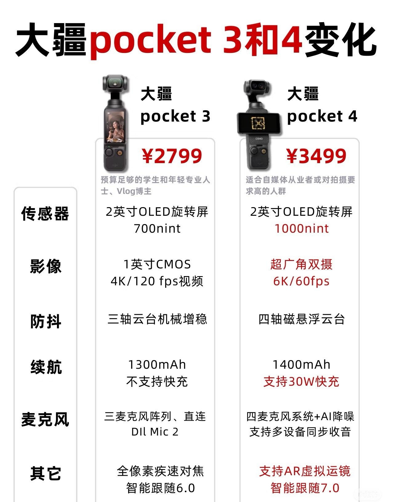 大疆Pocket4 Pocket 4 (即将发布): 这是目前大家最期待的新款!根据爆料,它将带来不少升级,比如传感器升级到1英寸+、新增超广角双摄、支持6K/60fps视频录制,屏幕亮度也更高了。预计价格在3499元起,可能会在2026年第一季度发布。