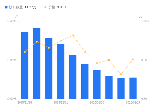 日期A股户数(户)流通A股户均持股数(股)户均持股市值(万元)2026-02-2711268231971.9231.682026-02-1311261731990.3730.972026-02-1011331031794.7231.482026-01-3011547131199.6930.732026-01-2011754330649.7230.742026-01-0912093729789.5630.622025-12-3112478628870.7029.452025-12-1912683828403.6328.662025-12-1013044327618.6528.132025-11-2812918227888.2527.96