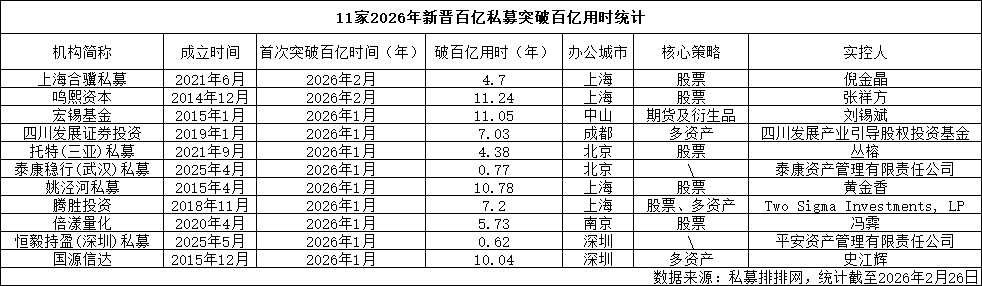 私募排排网数据显示,截至2026年2月26日,百亿私募数量已达125家,再创历史新高。2026年,共有11家私募机构首次突破百亿规模,其中在今年2月,上海合骥私募与鸣熙资本两家机构新晋百亿梯队。