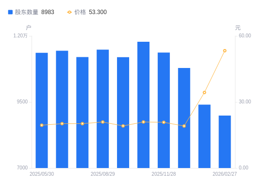 日期A股户数(户)流通A股户均持股数(股)户均持股市值(万元)2026-02-27898315997.2585.272026-01-30940015287.5852.452025-12-311078513324.3625.422025-11-281136910028.0420.832025-10-31117819677.3420.242025-09-301119610182.9919.472025-08-29114799931.9420.762025-07-311120110178.4520.512025-06-30114409965.8020.082025-05-301136310033.3319.51