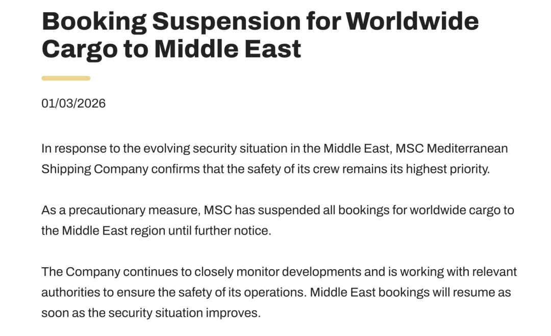货柜航运龙头地中海航运(MSC)3月1日发布公告,鉴于中东地区安全形势不断变化,所有全球范围内前往中东地区的货物预订,直至另行通知。