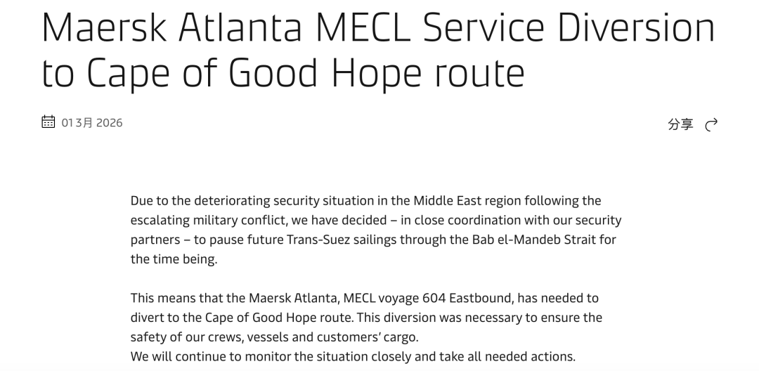 另一些船司等虽未完全停止订舱,但已明确避险或改道。例如,全球航运巨头马士基、德国集装箱航运公司赫伯罗特等均表示已暂停船只通过霍尔木兹海峡,并暂停曼德海峡与苏伊士运河的航线运营,相关船舶将改道经好望角航行。