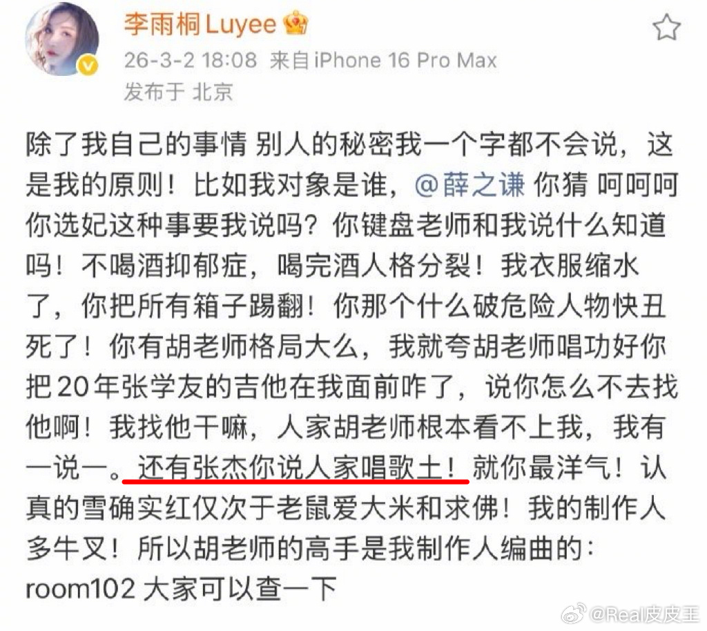 天呐,太抓马了。李雨桐爆料薛之谦有重婚罪,说薛之谦杀了她的孩子,还透露薛之谦说张杰唱歌土……