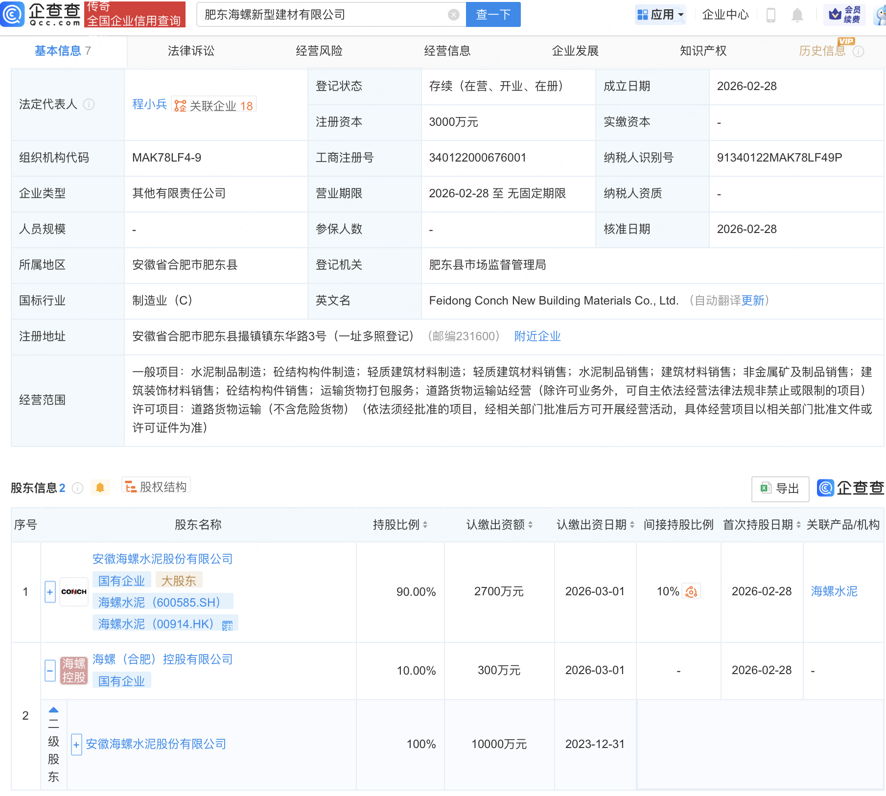 企查查APP显示,近日,肥东海螺新型建材有限公司成立,注册资本3000万元,经营范围包含:轻质建筑材料销售;水泥制品销售;建筑材料销售;非金属矿及制品销售等。企查查股权穿透显示,该公司由海螺水泥(600585)间接全资持股。