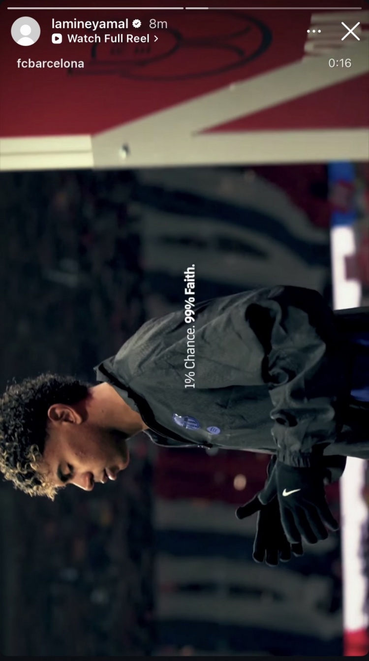 作为巴萨阵中攻城拔寨的关键球员,亚马尔显然不会甘心被马竞淘汰。在社交媒体上,他写道:1%的机会,99%的信念。