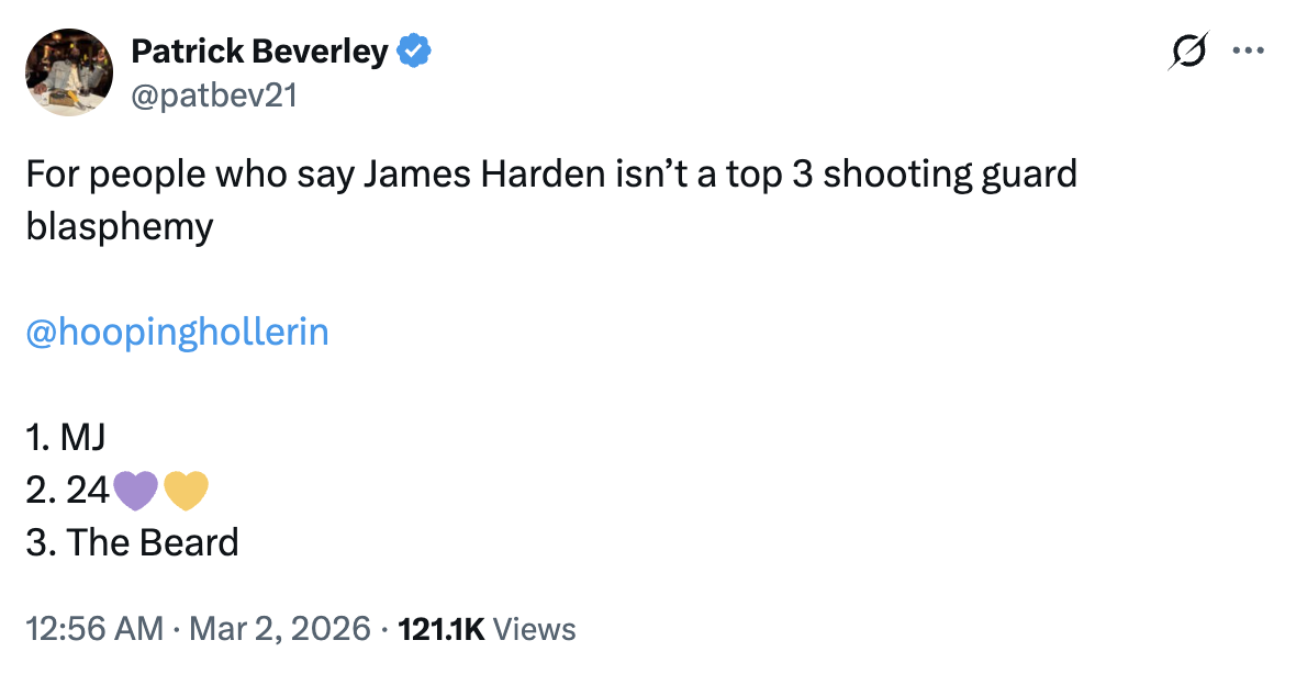 虎扑03月02日讯近日,帕特里克-贝弗利在个人社交媒体上发文力挺詹姆斯-哈登,直言将哈登排除在历史前三得分后卫之外的说法“简直是亵渎”。