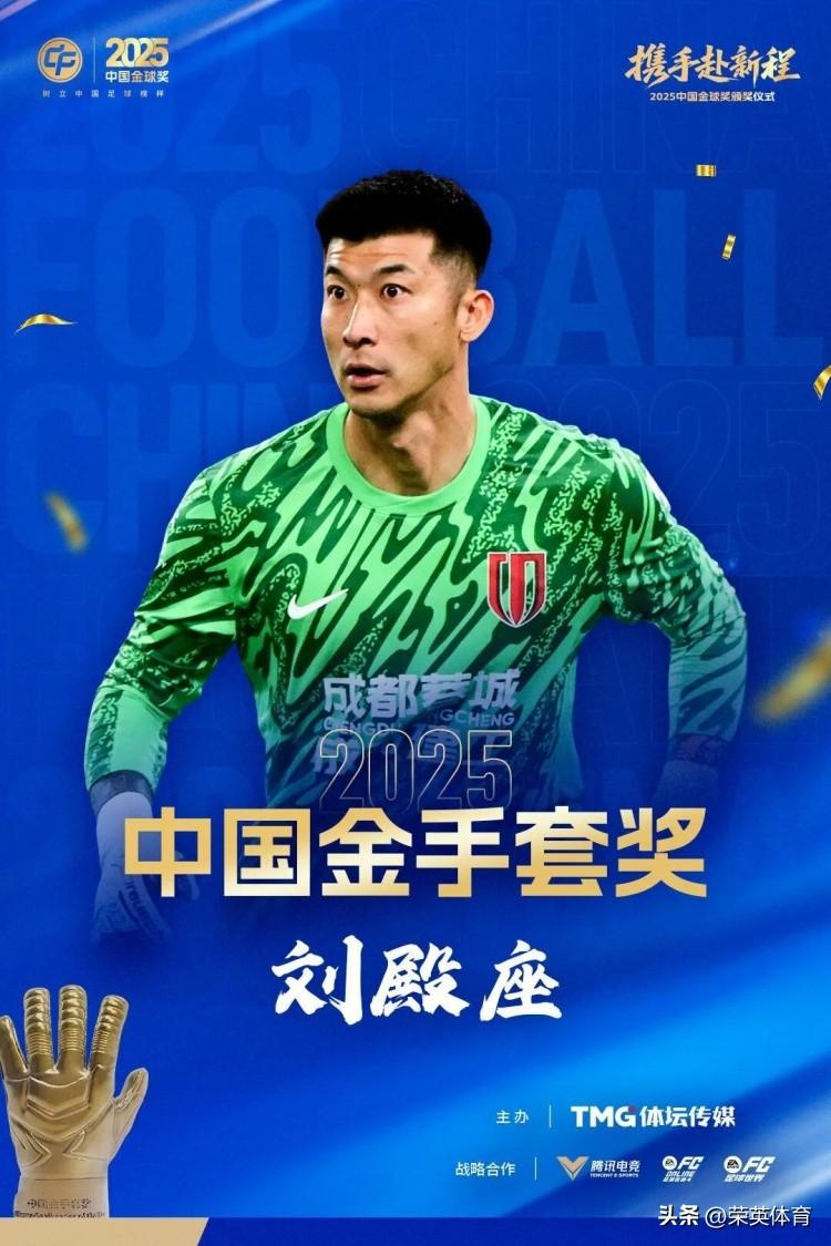 在2026中超联赛即将开赛之际,成都蓉城再获喜迅!成都蓉城的的刘殿座和帅帷浩在刚刚结束的中国金球奖评选中斩获金手套奖和金童奖! 在3月2日进行的中国金球奖的颁奖仪式上,中国金球奖的各大奖项揭晓!其中2025中国金手套奖的得主是成都蓉城的门将刘殿座!他也是2025中超联赛的最佳门将!在2025中超联赛中,成都蓉城名列中超联赛第三名,是中超联赛防守最佳的球队,作为主力门将的刘殿座发挥极其出色!凭在联赛中的出色发挥队获最佳门将和金手套奖实至名归! 而在U17中国金童奖评选中,来自成都蓉城的小将帅帷浩战胜了队友邝兆镭和魏祥鑫,捧得了U16中国金童奖的殊荣!