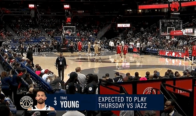 比赛第一节,转播镜头打出数据:特雷-杨将在对阵爵士时迎来复出。