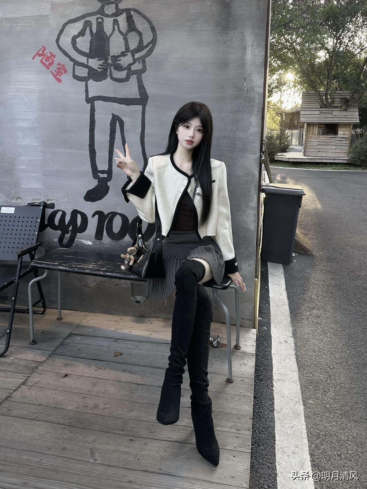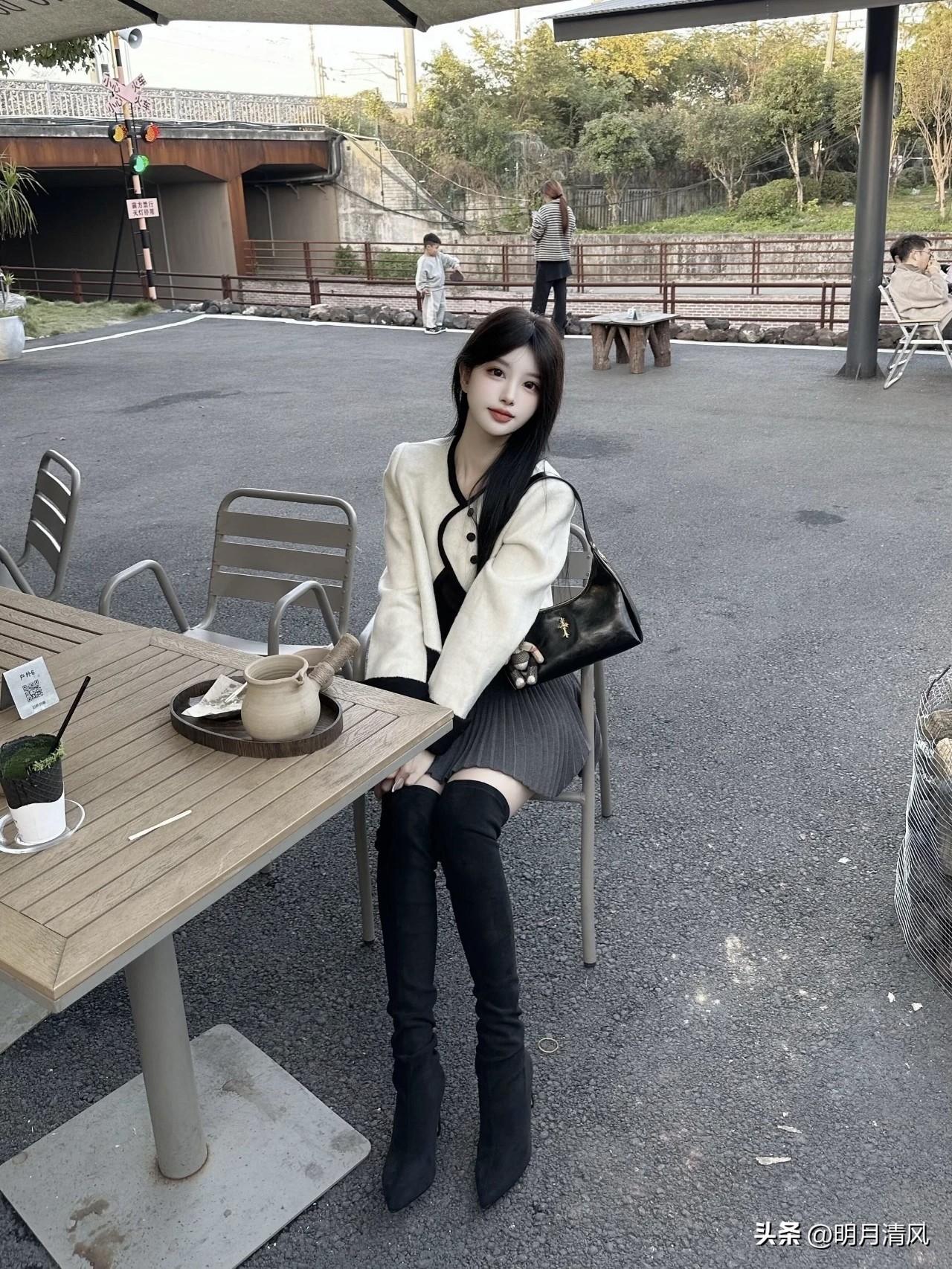 奶白色小外套配上灰色百褶裙,再来一双黑色过膝靴,今天这身我自己超喜欢! 以前总担心过膝靴不好驾驭,其实选对搭配真的又显瘦又减龄。小外套刚好到腰线,短裙露出一小截,长靴把腿线条拉得特别顺。走在街上感觉步伐都轻快了,朋友说看着像刚毕业的学生😊 发现穿搭的乐趣就在于混搭——轻熟的靴子配青春感的百褶裙,意外的和谐。就像生活里尝试新组合,常常会有小惊喜。 你们觉得这身怎么样? 时尚穿搭