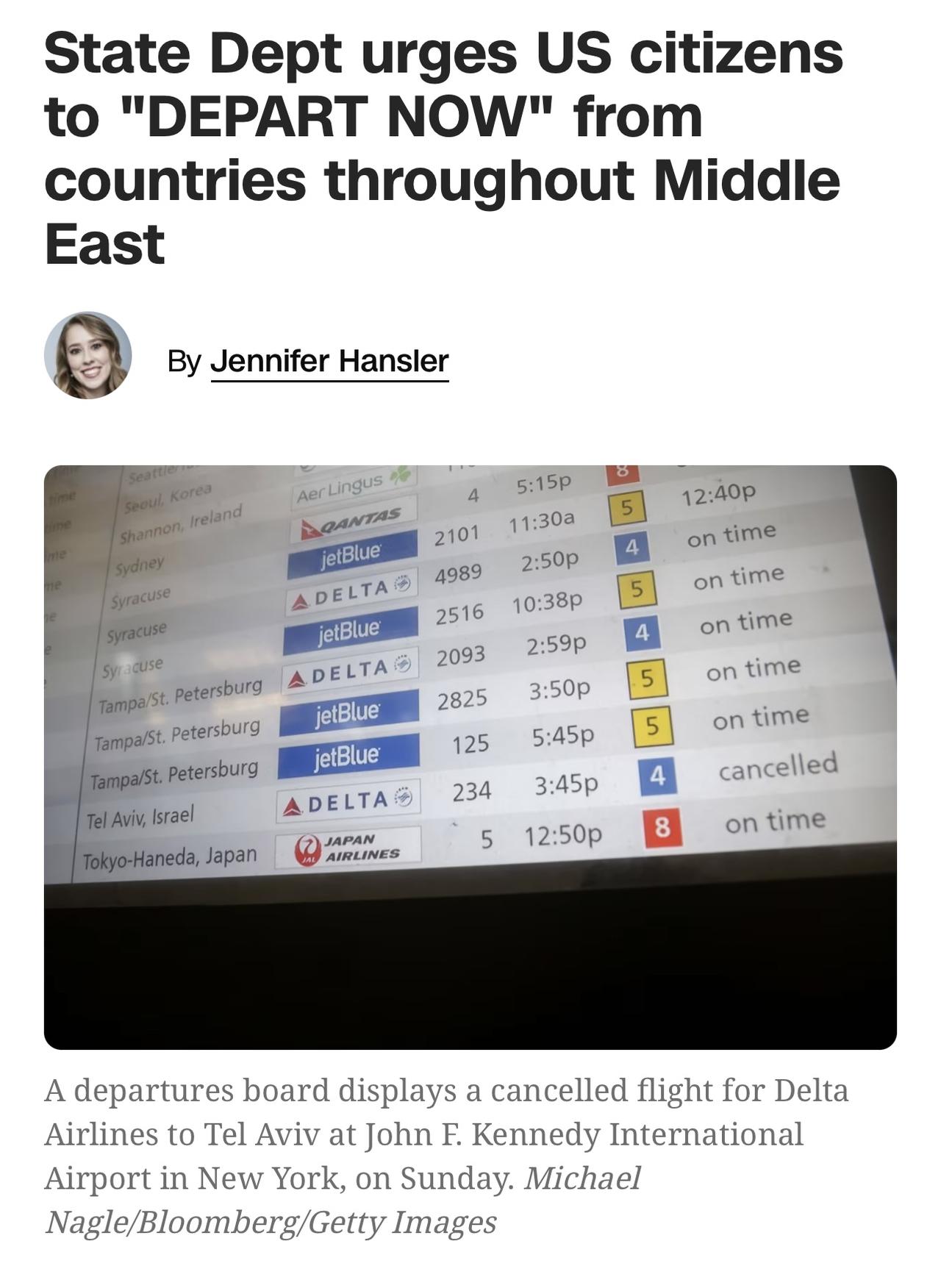 美国国务院领事事务高级官员在X上的帖子呼吁美国公民“使用可用的商业旅行”从巴林、埃及、伊朗、伊拉克、以色列、西岸和加沙、约旦、科威特、黎巴嫩、阿曼、卡塔尔、沙特阿拉伯、叙利亚、阿拉伯联合酋长国和也门出发。