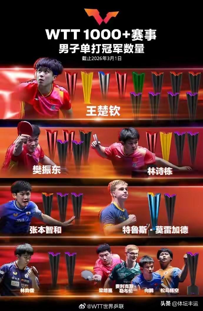 WTT新加坡大满贯结束后,WTT官方统计的1000级别以上赛事冠军数量榜太让人惊喜了!女单孙颖莎以15冠断层领跑,王曼昱7冠,王艺迪3冠,陈梦2冠。男单王楚钦12冠独自领先,樊振东5冠,林诗栋4冠。 孙颖莎的15冠可不是靠参赛数量堆出来的。WTT1000+赛事都是大满贯、冠军赛这种顶级硬仗,含金量超高。就像这次新加坡决赛,她4比2赢了王曼昱,而且是在伤病恢复后连续高强度作战拿下的,统治力可见一斑。王楚钦也很牛,12个冠军让他在男单领域闪耀。这数据一出来,感觉世界乒坛权杖已完成交接,未来可期! 乒乓球实力榜