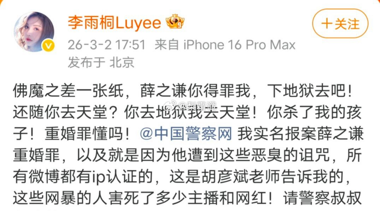 薛之谦的前女友李雨桐突然发了很多信息:实名举报薛之谦重婚罪、选妃、人格分裂等还透