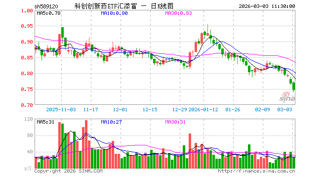 3月3日,截止午间收盘,科创创新药ETF汇添富(589120)跌2.74%,报0.746元,成交额1921.43万元。科创创新药ETF汇添富(589120)重仓股方面,百济神州截止午盘跌4.21%,艾力斯涨0.02%,百利天恒跌3.29%,君实生物跌4.05%,泽璟制药跌3.98%,博瑞医药跌2.91%,荣昌生物跌2.56%,特宝生物跌0.70%,益方生物跌2.44%,皓元医药跌4.36%。