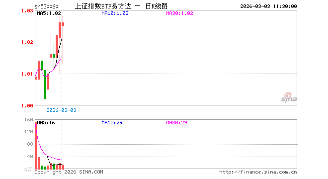 3月3日,截止午间收盘,上证指数ETF易方达(530060)涨0.00%,报1.026元,成交额1366.88万元。上证指数ETF易方达(530060)重仓股方面,农业银行截止午盘涨3.24%,工商银行涨2.30%,贵州茅台跌0.76%,中国石油涨10.04%,工业富联涨1.93%,中国人寿涨2.11%,招商银行涨1.66%,紫金矿业跌2.97%,中国平安涨1.32%,中国神华涨2.50%。