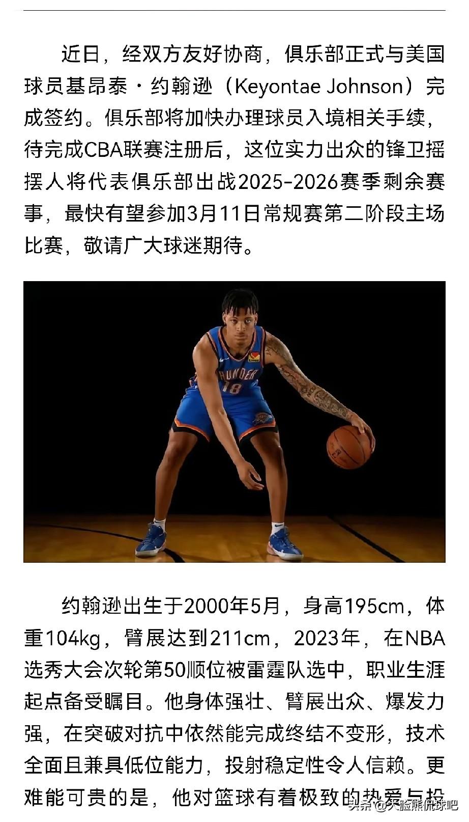 山东男篮正式官宣新外援加盟! 今天山东男篮正式官宣新外援加盟,不是戴维斯,也不是科尔.安东尼,而是效力过雷霆的锋卫摇摆人基素泰·约瀚逊! 恭喜山东男篮!