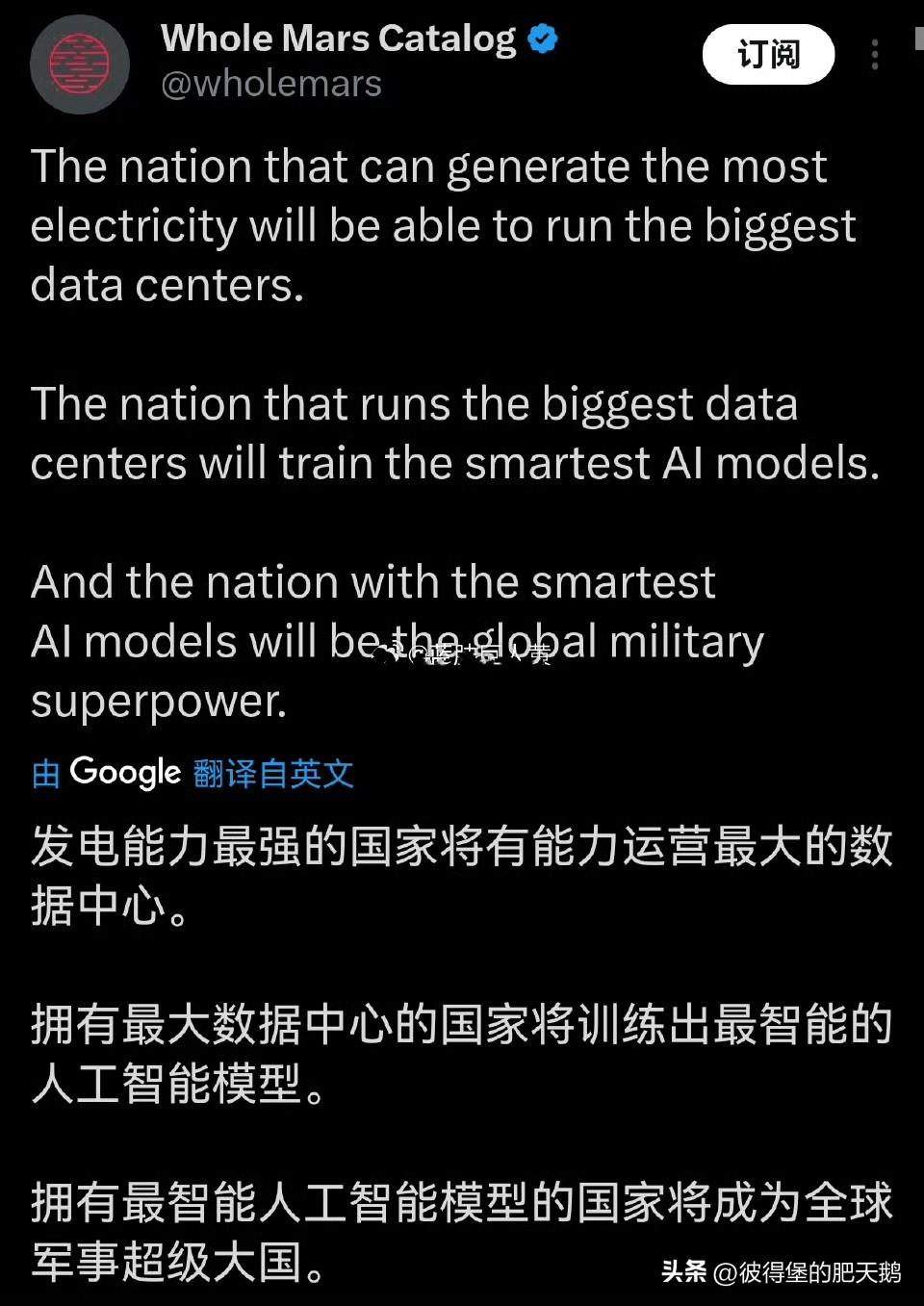 埃隆·马斯克就这样一条信息“中国的目前的发电量比美国和欧盟的总和多40%”发表评论:发电量是衡量工业产能的最佳单一指标。 还是这句话:自有外国大儒帮咱们辩经。 经不辩则不明。 Kevin Bambrough: 有人说,电力是衡量实际GDP的最佳指标之一。 中国是世界最大的经济体(按照购买力平价计算早几年就超过美国了)......长期以来一直如此。 Whole Mars Catalog: 发电能力最强的国家将有能力运营最大的数据中心。 拥有最大数据中心的国家将训练出最智能的人工智能模型。 拥有最智能人工智能模型的国家将成为全球军事超级大国。 Erik Voorhees: 美国和欧洲遭遇了令人震惊的失败 这是五十年来妖魔化增长和生产的后果。首先,这是一个文化问题;其次,这是一个监管问题,而后者总是源于文化。 Techaktien: 中国正在疯狂地建设核电站。我们正在拆除我们的建筑。世界上最愚蠢的能源政策。