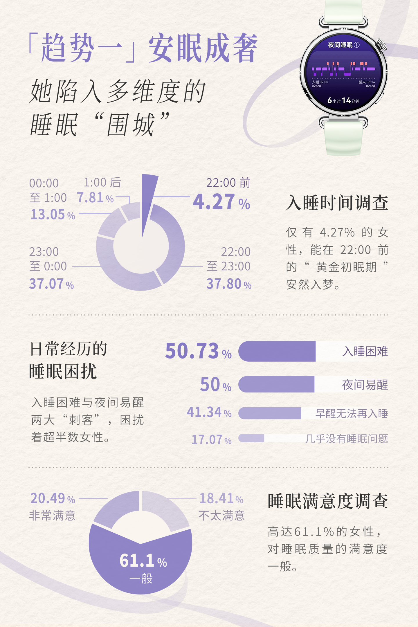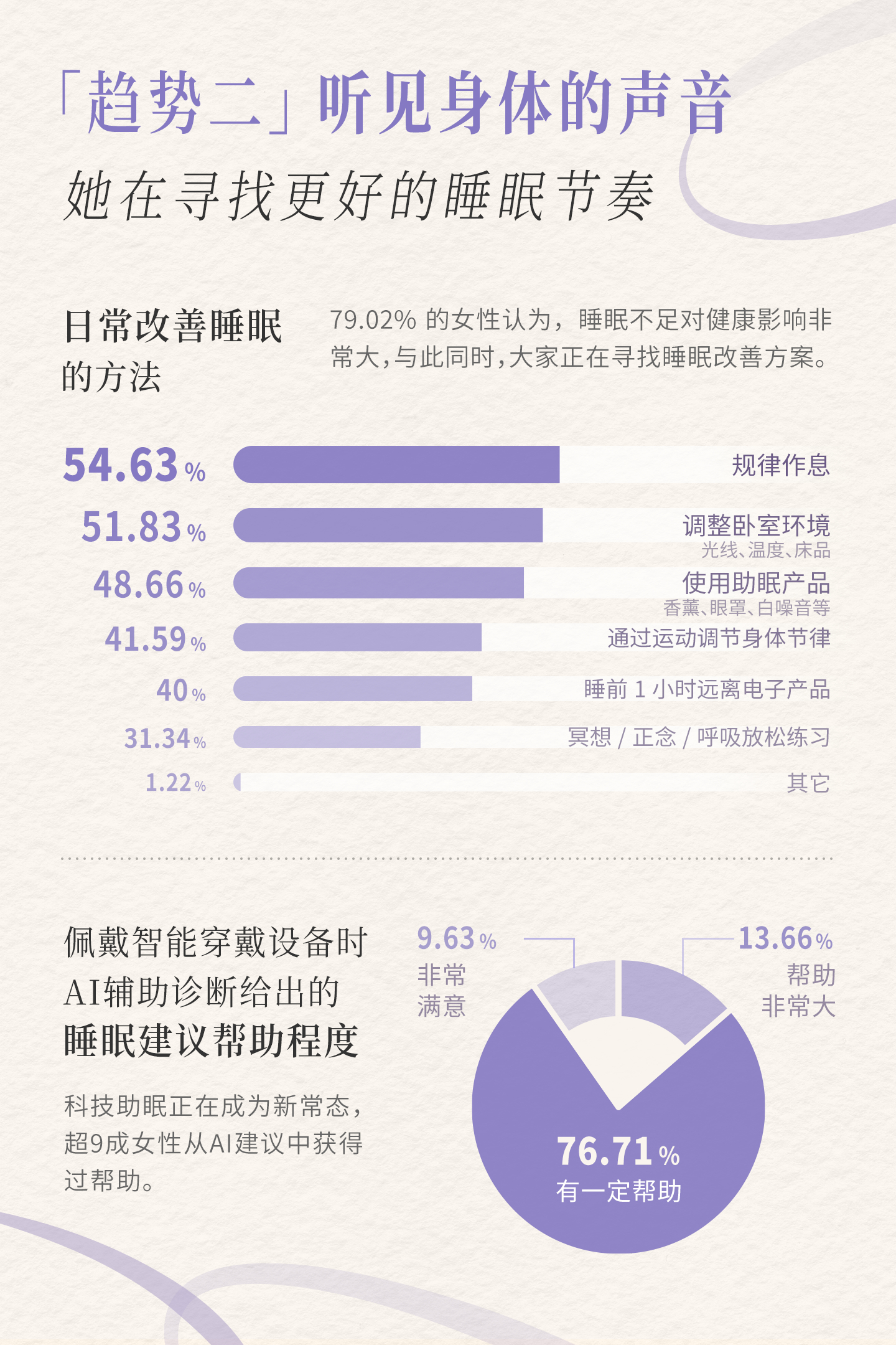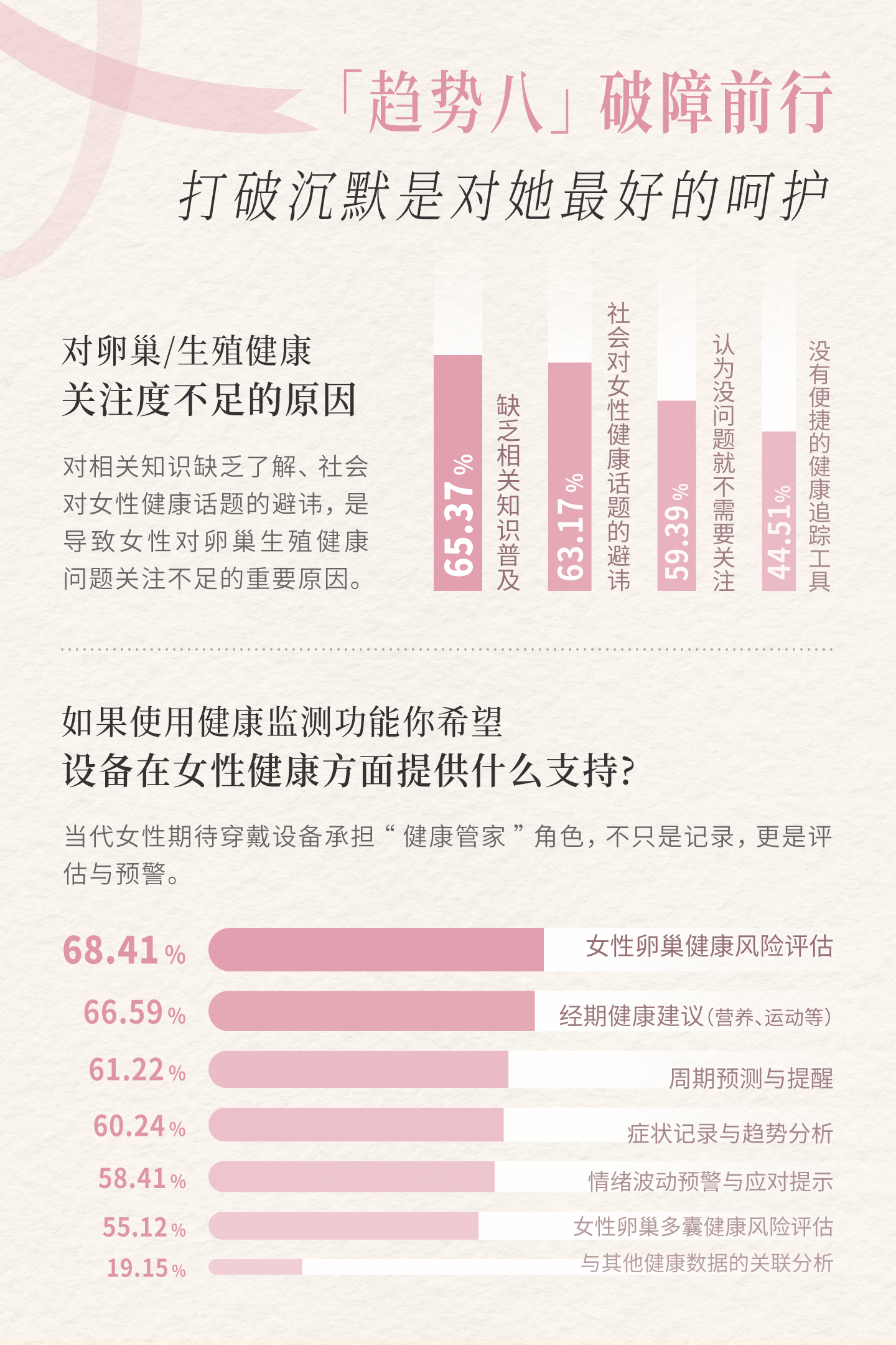 不足5%的女性能在晚10点前入睡目前,多数健康监测停留在“记录”层面:记录了你睡了多久,记录了你的经期日期。但白皮书揭示的深层需求是“预测”和“解释”。为什么超6成女性对卵巢健康处于被动状态?因为她们缺乏前瞻性的洞察。现在手表可能在你经期来临前数天,就预测到此次伴随的困倦感或情绪低落可能会更明显,并建议你提前调整日程,是健康科技的关键飞跃。