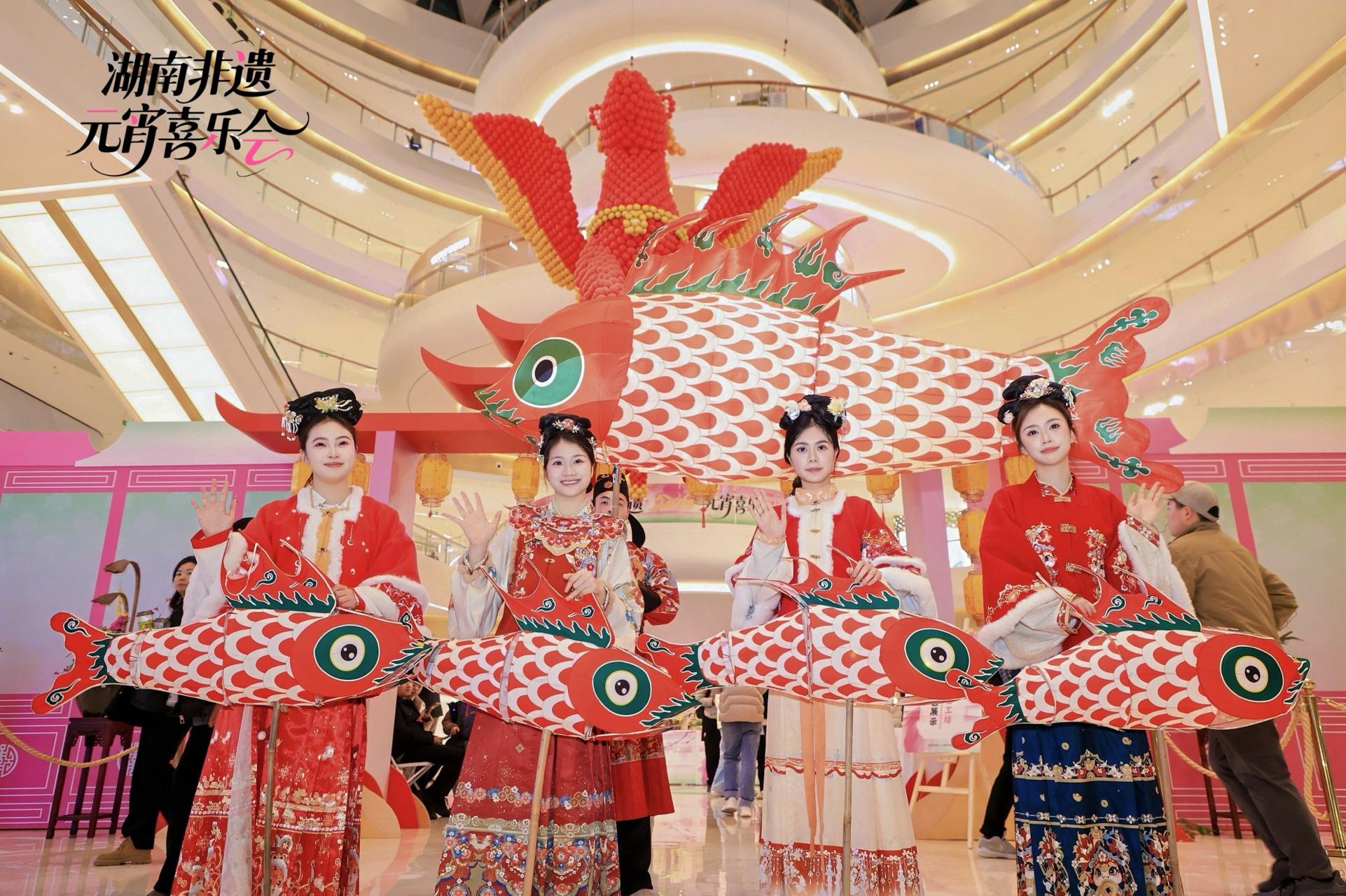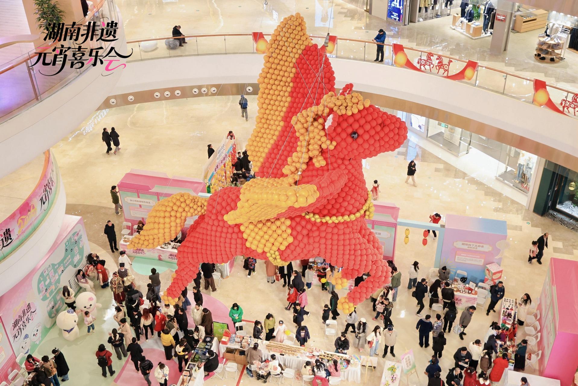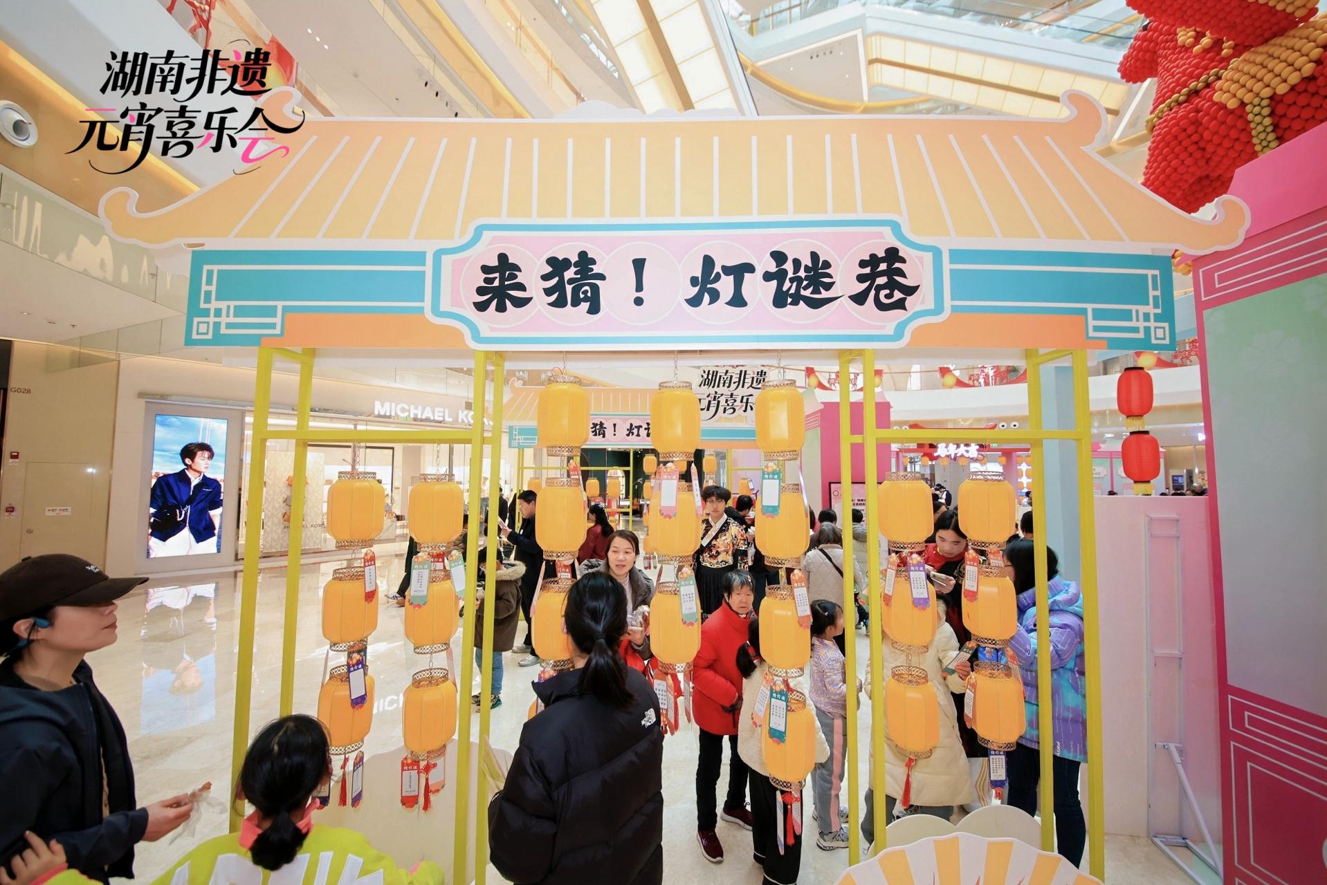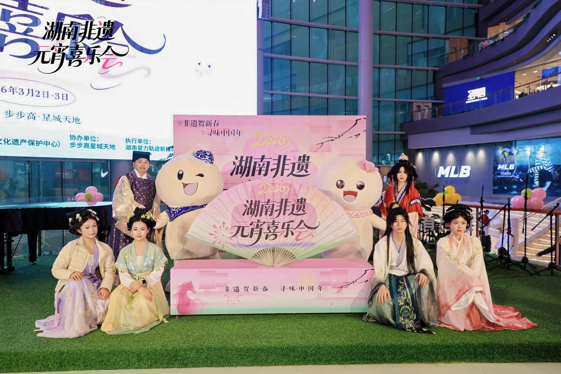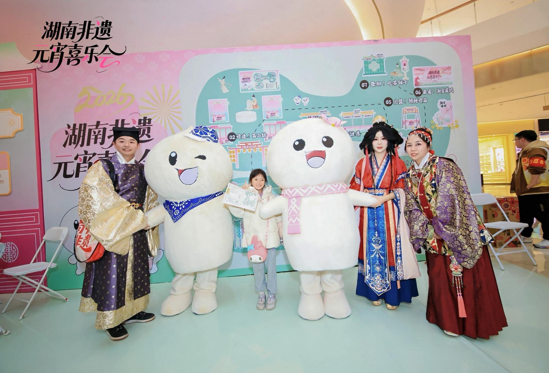此次喜乐会打造“开吃!百味街”“开造!百工坊”“来猜!灯谜巷”“放松!养生局”等七大主题活动板块,在商业空间里构建起一个沉浸式非遗展示体验空间,值得一提的是,融合蓝印花布、侗族织锦、湘绣芙蓉花等湘韵非遗元素的湖南非遗元宵IP“元宵宝宝”在活动现场首发亮相,憨态可掬的形象深受喜爱,成为现场打卡合影人气主角。
