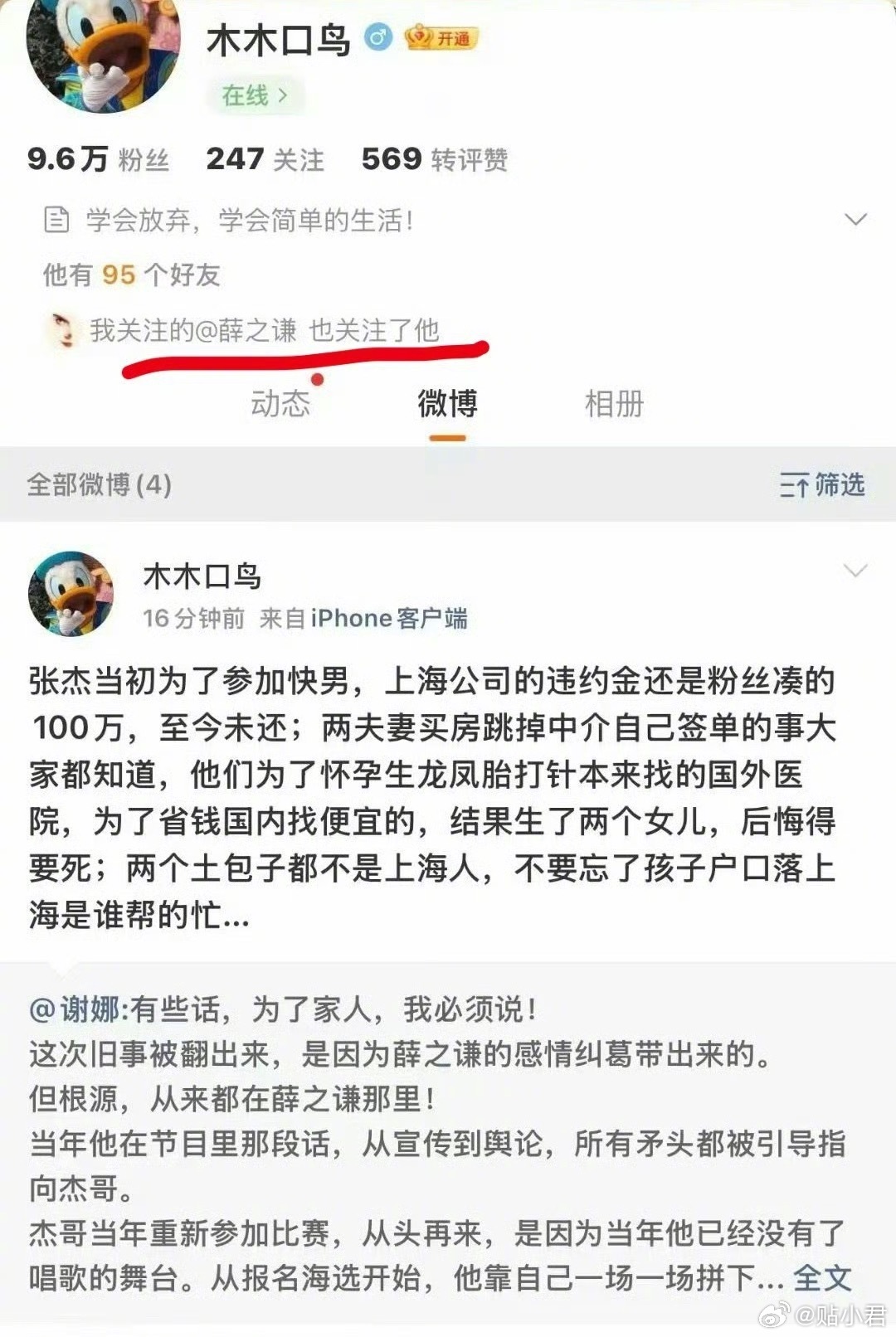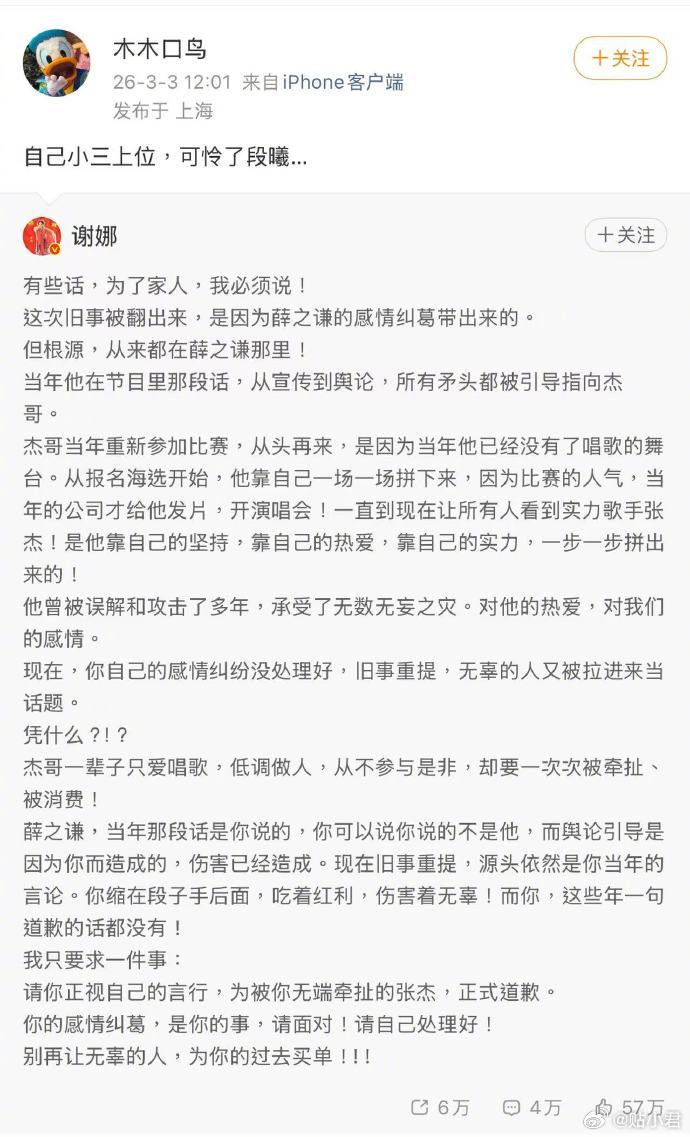薛之谦的好友、主持人朱桢以前的经纪人回撕谢娜了,说张杰谢娜是土包子,还说谢娜是小三。