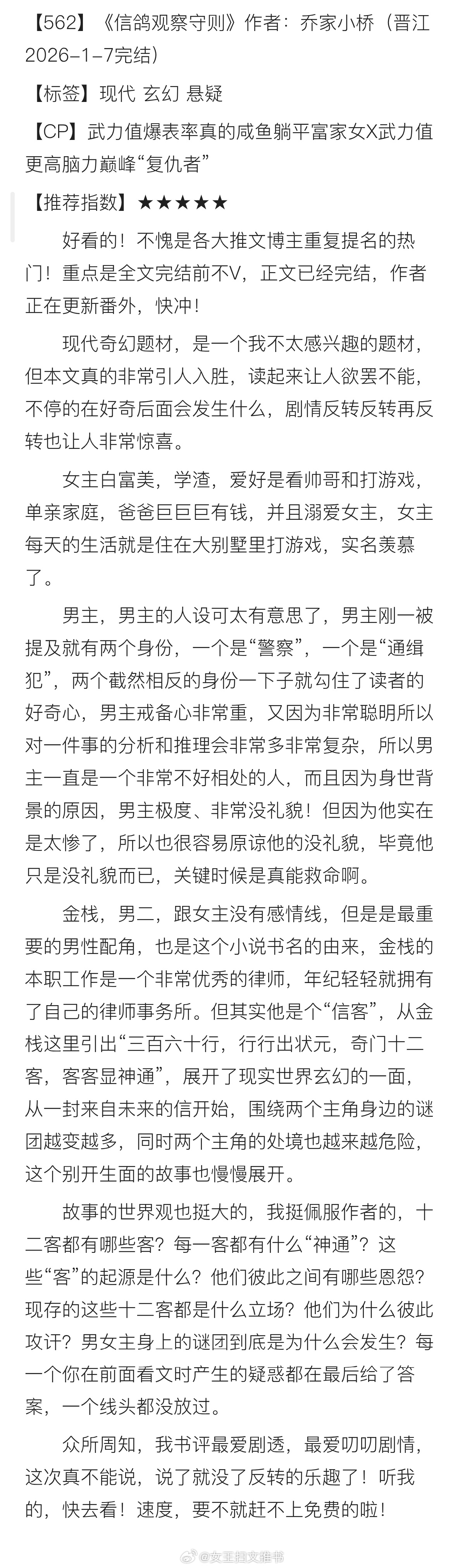 【562】《信鸽观察守则》作者:乔家小桥(晋江2026-1-7完结)【标签】现代 玄幻 悬疑【CP】武力值爆表率真的咸鱼躺平富家女X武力值更高脑力巅峰“复仇者”【推荐指数】★★★★★【简评】我不爱看现代奇幻,更不爱看现代悬疑,但是这个真的,让我欲罢不能,现在免费!免费!免费!快去看!