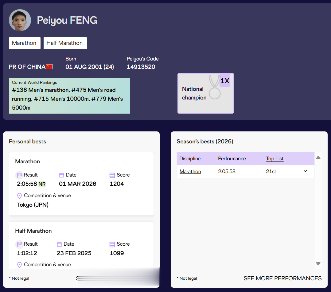 虎扑03月03日讯世界田联官网的数据库进行了更新,中国小将丰配友周末在2026东京马拉松跑出的2小时05分58秒的成绩已经被标记为(NR),即新的国家纪录。