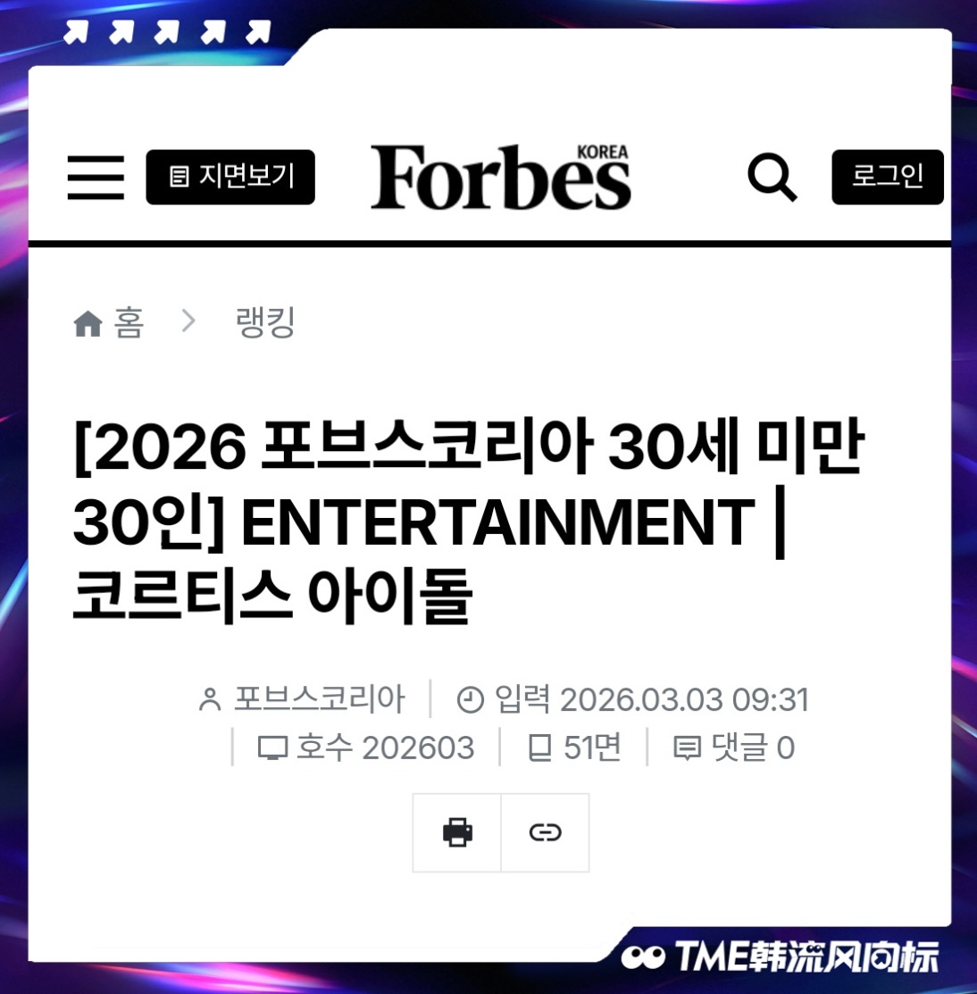 恭喜NCTWISH和 CORTIS入选了《福布斯韩国》2026年“30位30岁以