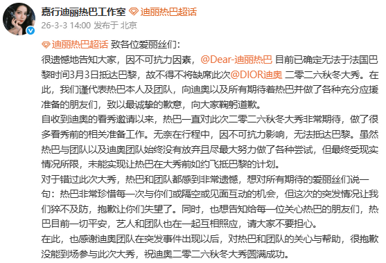 工作室回应迪丽热巴缺席时装周迪丽热巴方回应无法抵达巴黎 发文回应迪丽热巴缺席巴黎时装周原因:无奈在行程中,因不可抗力影响,无法抵达巴黎。