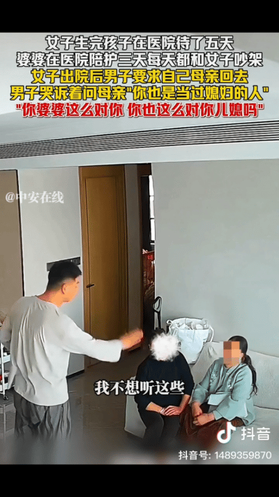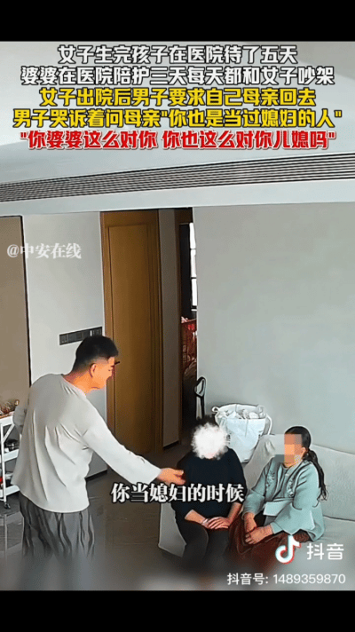 看哭了!四川一男子的媳妇生孩子在医院住了5天,母亲来了侍候了3天,媳妇刚出院回到家,男子就要求母亲回去,母亲表示要留下带孩子,不料,男子一番话让母亲无言以对,更令网友大呼:感动,值得! 据媒体3月2日的报道,男子的媳妇生完孩子后住院5天,母亲前来照顾,本来这也是好事,可让男子糟心的是,母亲来照顾了媳妇3天,每天都和媳妇吵架。 这天,媳妇出院后回到家,男子再也忍不住了,就在客厅里和母亲谈论了起来。 男子未开一言,早已哽咽:“我现在不想和你说任何话…” 母亲明白了儿子的意思,赶紧打断并解释:“我暂时待在这里可以帮你带孩子…” 而男子摆摆手,一脸的无奈:“我不需要,真的不需要,你在月子里就和她(媳妇)吵架,你也是当过媳妇的人,你当媳妇的时候,你遗传了你婆婆怎么对你…” 说到这里,男子哽咽了。 母亲此时还没意识到自己哪里错了,还辩解道:“我也不知道是咋回事。” 男子抹了抹脸上的泪水,又说:“对啊,你也是当媳妇过来的,你现在当婆婆了,你是怎么对待你媳妇的,我现在不想想这些,你就说你什么时候走…” 男子早已泣不成声,而母亲还是不为所动:“我在这看着。” 而男子已下定决心:“你直接说你什么时候走就行,我不多说!” 这时,男子的媳妇从房间里走出来安慰男子,男子就拉着媳妇回到房间了。 由此看来,这婆媳之间已经产生了矛盾,男子为了避免媳妇和母亲之间发生口角,就赶紧将媳妇拉回了房间。 不得不说,这样的局面,这位母亲已经不适合待下去了,再待下去,受到伤害的只有是自己的儿子。 站在旁观者的角度,很心疼这位男子,一边是为自己生儿育女正在坐月子的媳妇,一边是养育自己的母亲,他这是陷入两难了,不然也不会泣不成声。 虽然我们不知道婆媳之间吵架是谁的错,但在这种情况下,男子做出的决定还是对的,毕竟,媳妇为他拼命生下孩子,正好是坐月子期间也是需要家人照顾的时间,有什么错就不能忍一忍吗? 再说了,男子说的也没错,做为母亲也曾是媳妇,怎么忍心让媳妇受自己曾经受过的伤呢? 爱乌及屋,做为母亲如果做不到将儿子爱的人如同爱儿子般来疼爱,不如趁早离开。