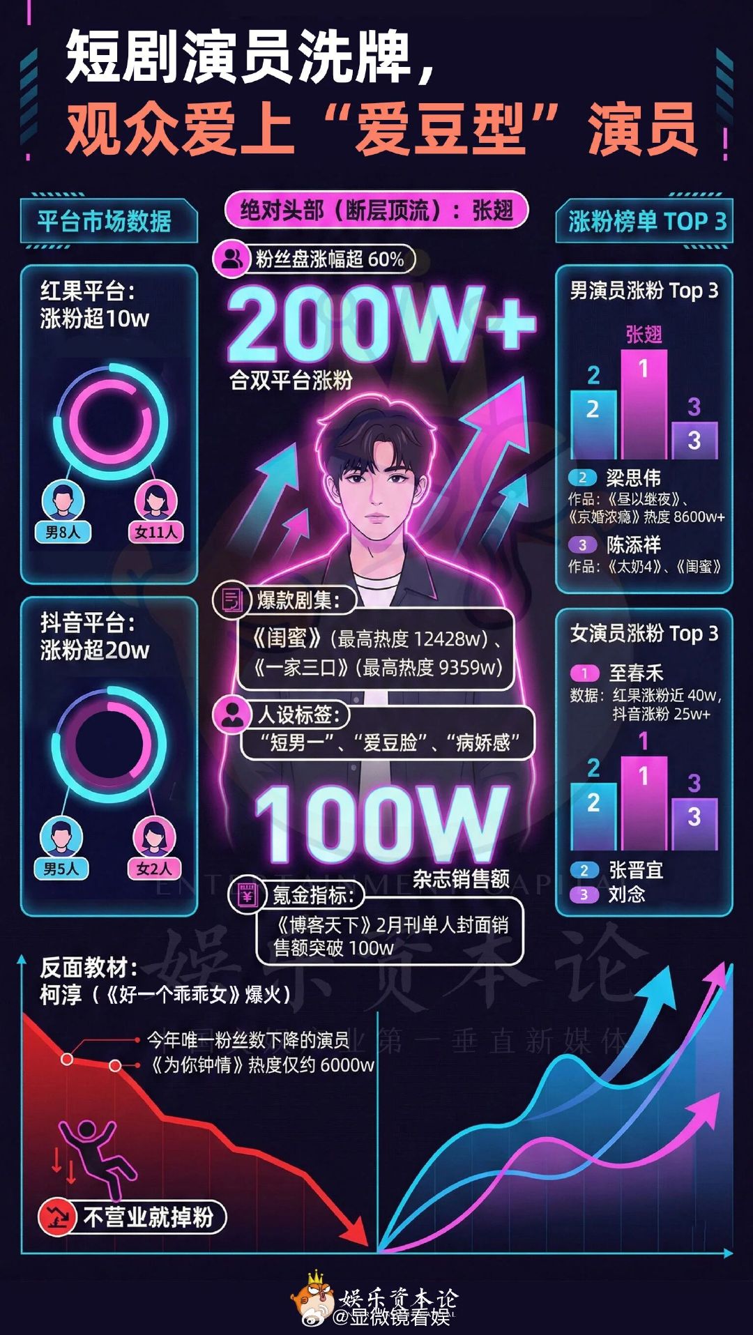 短剧演员爱豆化短剧演员偶像化转型以张翅、吴添豪为代表的新晋短剧顶流,正全方位复刻内娱流量艺人的成熟运营模式,短剧演员的偶像化转型步伐也在持续加快。这批新晋顶流从开通个人工作室账号、进行规范化的形象与运营管理,到日常保持高频次密集营业、维持与粉丝的高频率互动,再到登上地方卫视春晚、接连承接各类商业商务活动,整体发展路径与内娱流量爱豆高度契合。其商业发展路径也不再局限于短剧剧集本身,而是向杂志、商务、晚会等多领域拓展,让短剧演员的职业发展边界得到大幅拓宽。