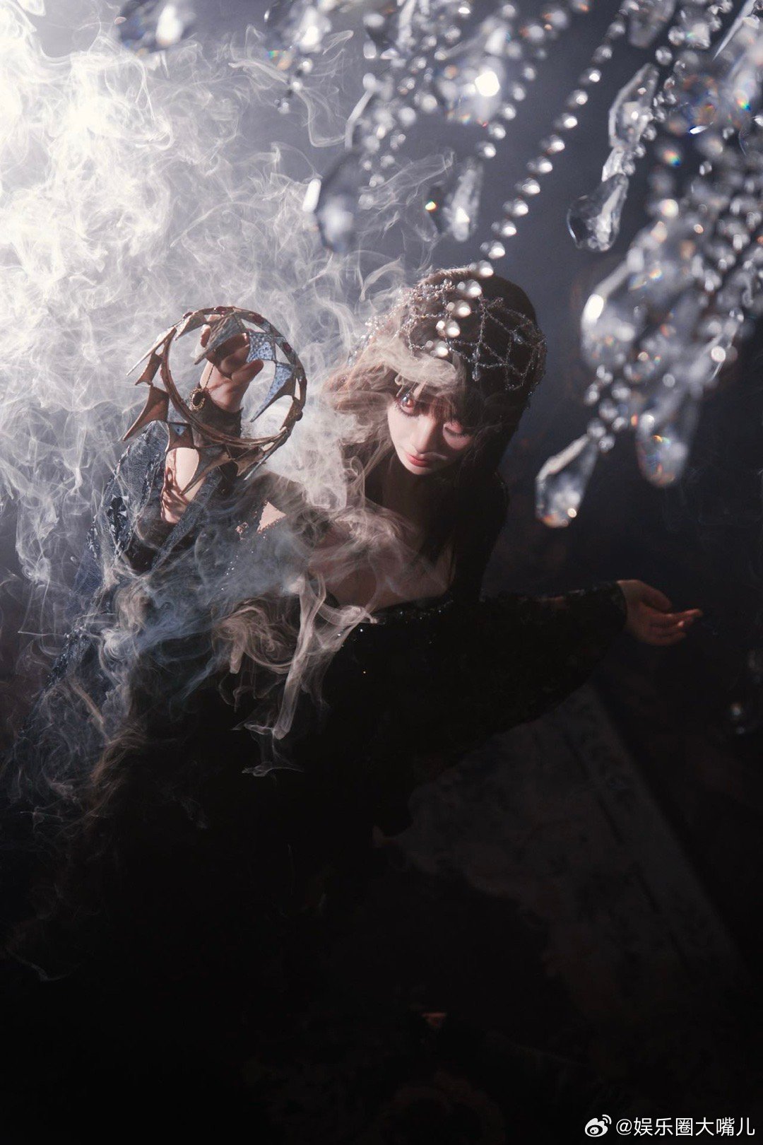 胡意旋小白花爆改黑玫瑰 胡意旋这身黑色蕾丝长裙太绝了,手拿王冠站在那里,像暗夜女王。从温柔小白花到神秘黑玫瑰,这跨度让人眼前一亮。