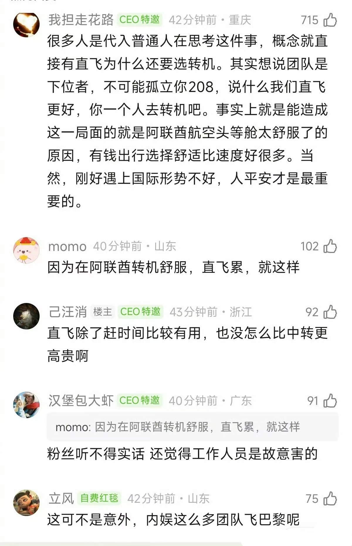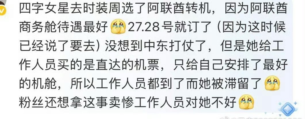 又有人分析了迪丽热巴中转而不直飞的原因,说是因为直飞很累,有钱出行舒适比速度更重要,而阿联酋商务舱待遇最好,27号出发说明是给中转留了行程,这理由充分吗?